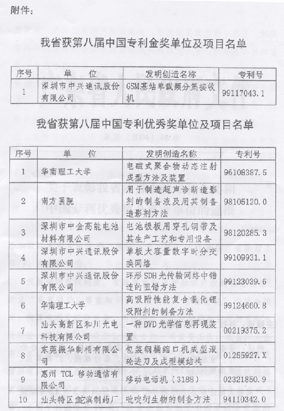 | 各地級以上市人民政府,各縣(市、區(qū))人民政府,省政府各部門、各直屬機構(gòu): 完善知識產(chǎn)權(quán)制度,營造尊重和保護知識產(chǎn)權(quán)的良好氛圍,樹立“尊重勞動、 尊重知識、尊重人才、尊重創(chuàng)造”的社會風尚,構(gòu)建有利于經(jīng)濟發(fā)展、科技進步、 文化繁榮的法律制度和市場環(huán)境,是我省各級政府長期致力的一項重要工作。我 省廣大企事業(yè)單位積極開展發(fā)明創(chuàng)造活動和知識產(chǎn)權(quán)保護工作,為提高我省擁有 自主知識產(chǎn)權(quán)的核心競爭力進行了不懈的努力。在已經(jīng)揭曉的第八屆中國專利獎 評選活動中,我省共獲得中國專利金獎1項、中國專利優(yōu)秀獎10項,我省企業(yè) 實現(xiàn)了中國專利金獎零的突破。為進一步鼓勵發(fā)明創(chuàng)造,加強知識產(chǎn)權(quán)保護工作, 提高我省的核心競爭力,省人民政府決定對榮獲中國專利金獎的深圳市中興通訊 股份有限公司給予100萬元的獎勵,對榮獲中國專利優(yōu)秀獎的華南理工大學等 10家企事業(yè)單位分別給予50萬元的獎勵,并在全省予以通報表彰。 希望全省廣大企事業(yè)單位要以獲得中國專利金獎和中國專利優(yōu)秀獎的單位為 榜樣,將實施知識產(chǎn)權(quán)戰(zhàn)略與企業(yè)經(jīng)營發(fā)展戰(zhàn)略有機地結(jié)合起來,不斷加強技術(shù) 創(chuàng)新和知識產(chǎn)權(quán)保護工作,促進我省自主知識產(chǎn)權(quán)產(chǎn)出數(shù)量和質(zhì)量的提高,全面 提升我省的綜合競爭力。受表彰的單位要繼續(xù)發(fā)揚成績,再接再厲,創(chuàng)造更多更 高技術(shù)水平的核心專利技術(shù),為我省提高自主知識產(chǎn)權(quán)的核心競爭力和率先基本 實現(xiàn)社會主義現(xiàn)代化做出新的更大的貢獻。 附件:我省獲得第八屆中國專利金獎、中國專利優(yōu)秀獎單位及項目名單 廣東省人民政府 二○○四年五月九日 |