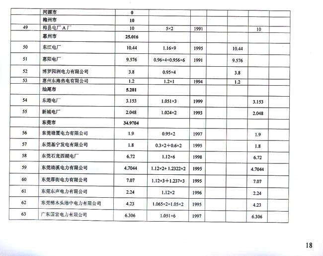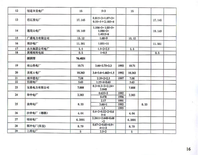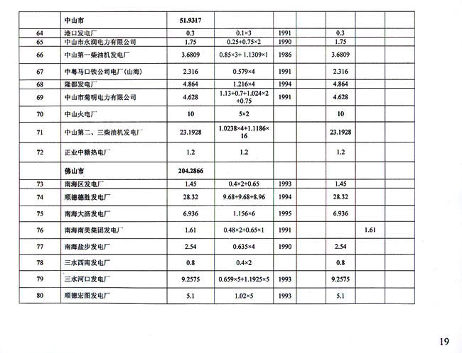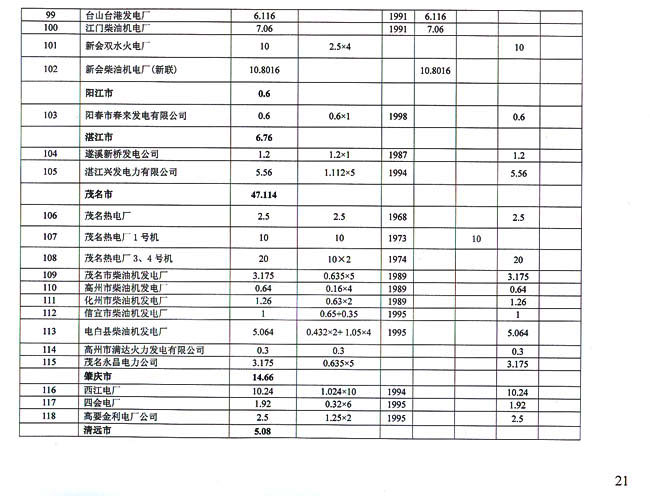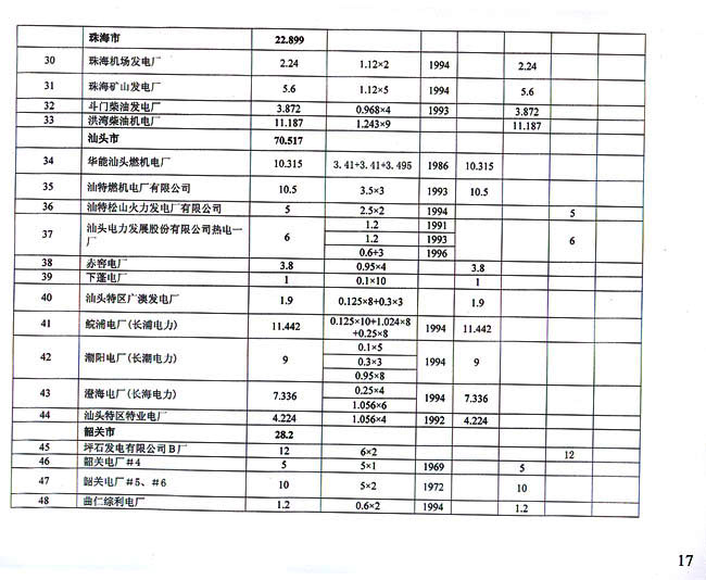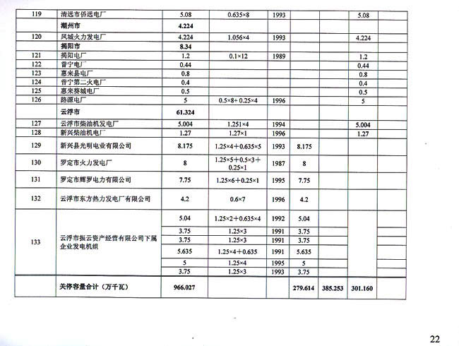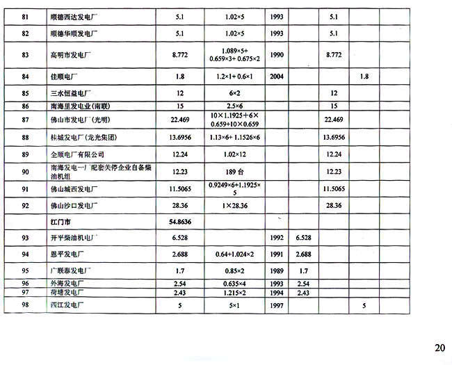 注:本表所列關(guān)停機(jī)組包括四個(gè)部分:一是國(guó)家發(fā)展改革委與省政府簽訂的廣東省“十一五”期間關(guān)停小火電機(jī)組責(zé)任書中的機(jī)組。經(jīng)進(jìn)一步核實(shí),該責(zé)任書中,中山小欖發(fā)電廠與中山市菊明電力有限公司系同一項(xiàng)目;永寧發(fā)電廠與中山市永潤(rùn)電力有限公司系同一項(xiàng)目;江門發(fā)電廠與江門柴油機(jī)廠系同一項(xiàng)目,屬重復(fù)計(jì)算。鑒此,本表中相應(yīng)剔除了前者,共計(jì)調(diào)減容量8.38萬千瓦。二是補(bǔ)列已經(jīng)納入“上大壓小”電源項(xiàng)目配套關(guān)停但未列入責(zé)任書的中山市正業(yè)中糖熱電廠1.2萬千瓦。三是核實(shí)機(jī)組銘牌容量后調(diào)增容量4.3萬千瓦。四是根據(jù)佛山市、省粵電集團(tuán)公司提出增加關(guān)停小火電機(jī)組規(guī)模、相應(yīng)實(shí)施“上大壓小”電源項(xiàng)目建設(shè)的要求,增加關(guān)停佛山市的佛山沙口發(fā)電廠28.36萬千瓦、佛山城西發(fā)電廠11.14萬千瓦;茂名市的茂名熱電廠#1、#3、#4號(hào)機(jī)(3×10萬千瓦),合計(jì)增加容量69.5萬千瓦。經(jīng)上述調(diào)整之后,全省“十一五”期間關(guān)?;痣姍C(jī)組總?cè)萘繛?66萬千瓦。