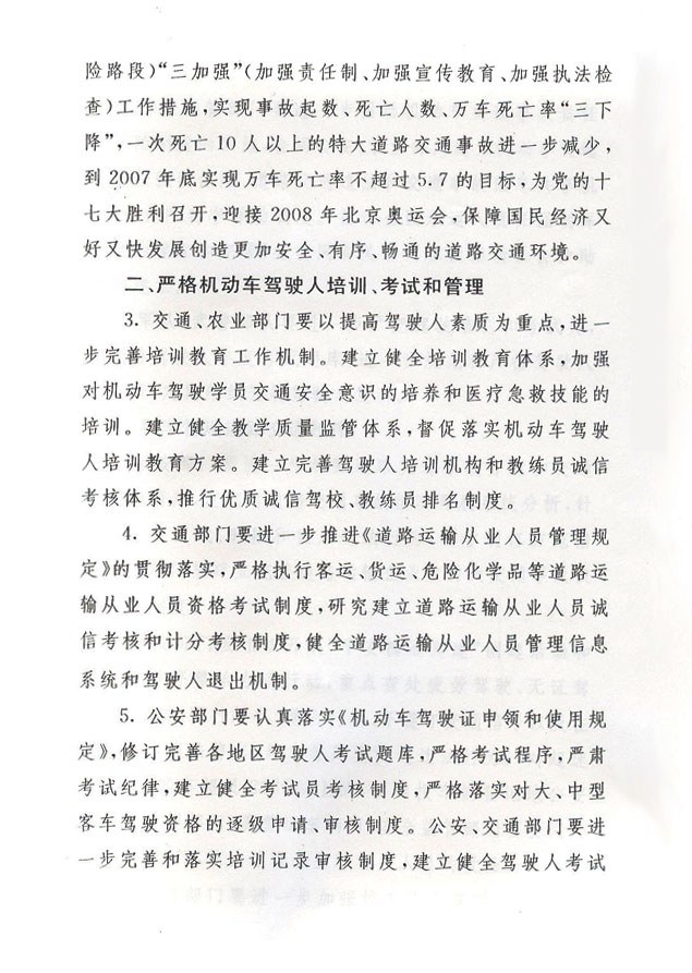 一、提高思想認(rèn)識。各地、各有關(guān)部門要從實踐“三個代表”重要思想,全面落實科學(xué)發(fā)展觀,構(gòu)建社會主義和諧社會的高度,充分認(rèn)識加強(qiáng)道路交通安全管理,預(yù)防道路交通事故的重大意義,以“五整頓”(整頓駕駛員隊伍、整頓路面行車秩序、整頓交通運(yùn)輸企業(yè)、整頓機(jī)動車生產(chǎn)改裝企業(yè)、整頓危險路段)“三加強(qiáng)”(加強(qiáng)責(zé)任制、加強(qiáng)宣傳教育、加強(qiáng)執(zhí)法檢查)為主線,切實加強(qiáng)道路交通安全管理,及時消除各類安全隱患,有效預(yù)防和減少重特大道路交通事故發(fā)生,實現(xiàn)事故起數(shù)、死亡人數(shù)、萬車死亡率“三下降”,一次死亡10人以上的特大道路交通事故進(jìn)一步減少,到2007年底全省萬車死亡率不超過5.6的目標(biāo),為促進(jìn)我省經(jīng)濟(jì)社會又好又快發(fā)展,迎接黨的十七大勝利召開創(chuàng)造良好的交通環(huán)境。