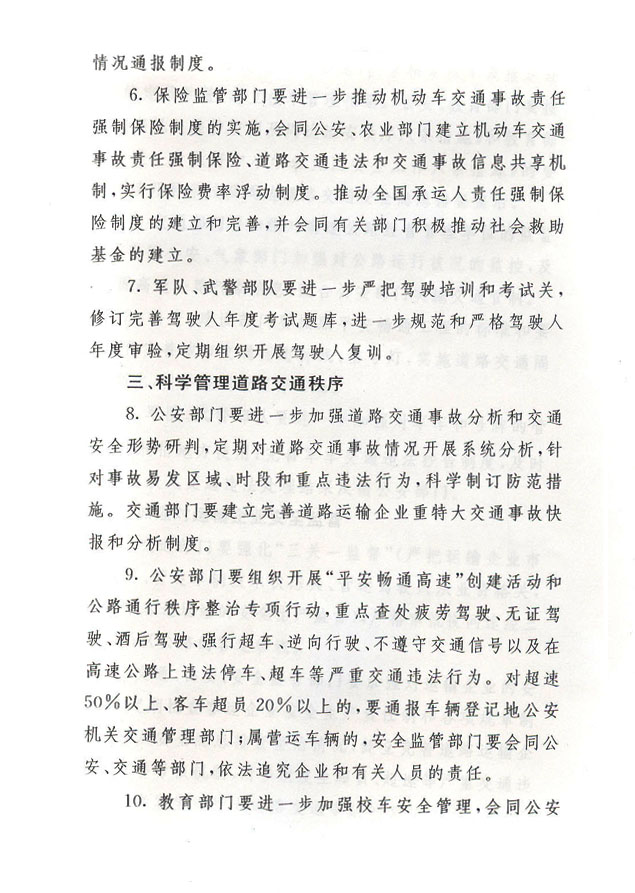 二、制訂實施方案。各地、各有關(guān)部門要根據(jù)國辦發(fā)〔2007〕35號文要求,結(jié)合實際,研究制訂具體的實施方案,及時召開預(yù)防道路交通事故聯(lián)席會議進(jìn)行具體部署;各有關(guān)部門要加強(qiáng)溝通協(xié)調(diào),密切配合,齊抓共管,形成合力,確?!拔逭D”“三加強(qiáng)”各項工作措施落實到位。各地級以上市的具體實施方案于2007年8月25日前報省預(yù)防道路交通事故聯(lián)席會議辦公室。