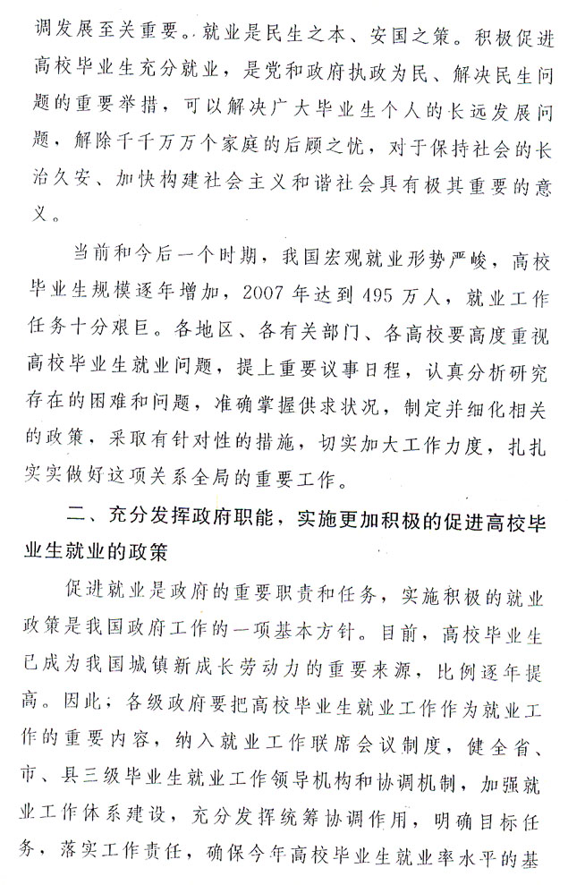 高校畢業(yè)生是社會寶貴的人才資源,其就業(yè)問題關(guān)系到廣大人民群眾的切身利益,是全社會就業(yè)工作的重要組成部分。做好高校畢業(yè)生就業(yè)工作,對于貫徹落實科學發(fā)展觀,實施科教興粵戰(zhàn)略,促進經(jīng)濟社會又好又快地發(fā)展,維護社會長治久安,建設創(chuàng)新型廣東和社會主義和諧社會具有深遠意義。省委、省政府對此高度重視,多次下發(fā)文件、召開會議進行部署。在各地、各部門和各高校的共同努力下,我省高校畢業(yè)生就業(yè)工作近年來取得顯著成績,就業(yè)率位居全國前列,2006年本科和高職高專畢業(yè)生的初次就業(yè)率分別達到90.42%、87.15%,最終就業(yè)率分別達到97.23%、95.57%。但是,隨著高校畢業(yè)生規(guī)模的逐年增加和社會需求增長緩慢,高校畢業(yè)生就業(yè)供需矛盾日益突出,就業(yè)壓力越來越大。2007年,我省高校畢業(yè)生人數(shù)再創(chuàng)歷史新高,達27萬人,加上外省高校來粵就業(yè)的畢業(yè)生,以及前兩年未落實就業(yè)崗位的省內(nèi)外高校畢業(yè)生,預計今年在我省求職擇業(yè)的畢業(yè)生將超過42萬人。在全社會就業(yè)崗位增幅有限的情況下,高校畢業(yè)生就業(yè)形勢不容樂觀。各級政府、各部門和各高校要認清形勢,提高認識,牢固樹立政治意識、大局意識和責任意識,把思想和行動統(tǒng)一到國家和省的各項決策部署上來,增強工作的積極性、主動性和創(chuàng)造性,克服困難,扎實工作,確保就業(yè)率水平保持穩(wěn)定,確保實現(xiàn)就業(yè)人數(shù)穩(wěn)步增長,努力開創(chuàng)高校畢業(yè)生就業(yè)工作的新局面。