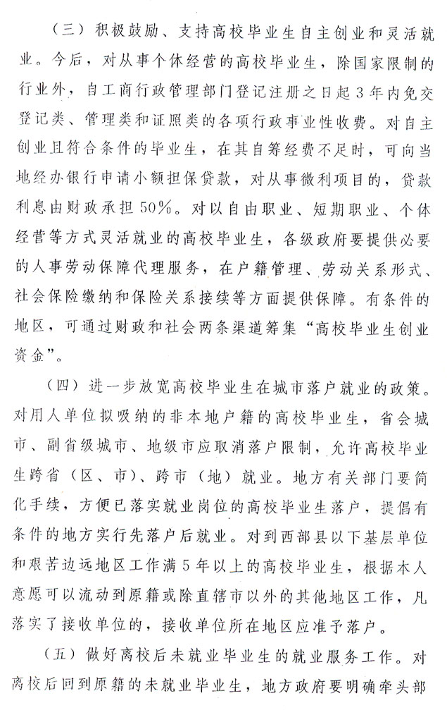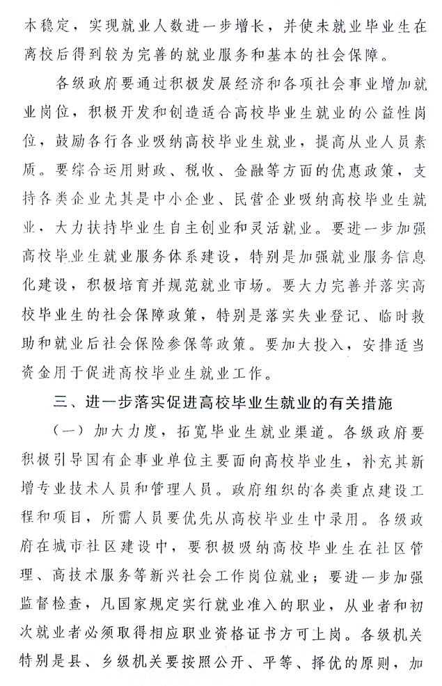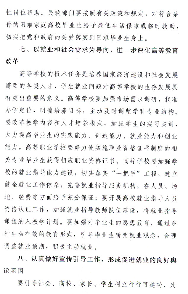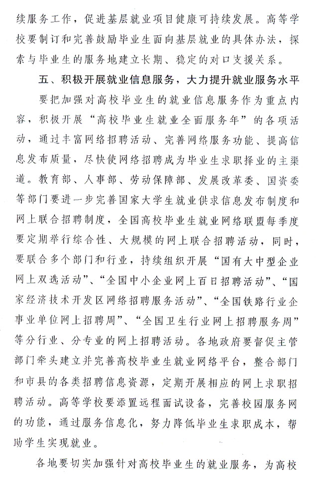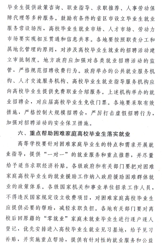 ?。ㄒ唬┘訌姼咝.厴I(yè)生就業(yè)指導和就業(yè)信息服務。今年是全國高校畢業(yè)生就業(yè)服務年。各級政府、各有關(guān)部門要積極為高校畢業(yè)生尤其是未落實就業(yè)崗位的高校畢業(yè)生排憂解難,提供政策咨詢、職業(yè)指導、求職推薦、見習及崗前技能培訓、人事代理服務等就業(yè)服務和更多的供需信息。要進一步完善我省以高校為基礎的高校畢業(yè)生就業(yè)市場建設,加快區(qū)域性高校畢業(yè)生就業(yè)市場建設步伐。嚴格控制大規(guī)模招聘會,嚴厲打擊虛假招聘行為,凡涉及高校畢業(yè)生就業(yè)的招聘活動,必須報省級主管部門審批。