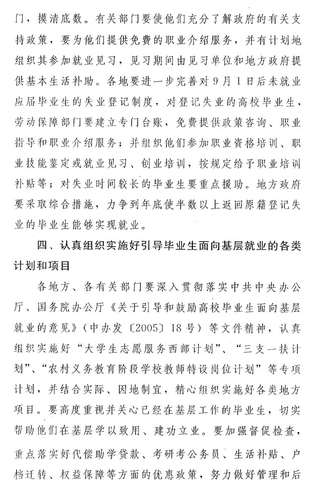 ?。ㄋ模┣袑嵶龊卯厴I(yè)生離校和接收服務工作。各高校要加強畢業(yè)教育,并積極組織力量,便捷、高效、優(yōu)質(zhì)地為畢業(yè)生辦理畢業(yè)離校手續(xù)。各級政府、各有關(guān)部門要減少環(huán)節(jié)、提高效率,做好畢業(yè)生接收工作,使畢業(yè)生安全離校、順利上崗。2007年9月1日后,返回生源地未就業(yè)的應屆高校畢業(yè)生,可到戶籍所在地勞動保障部門進行失業(yè)登記,按規(guī)定享受公共就業(yè)服務。勞動保障部門要對失業(yè)時間較長的畢業(yè)生重點給予援助,將辦理失業(yè)登記且生活困難的高校畢業(yè)生納入全省“三年30萬城鄉(xiāng)就業(yè)援助工程”對象,為其提供免費職業(yè)技能培訓和鑒定,實現(xiàn)“一對一”全程動態(tài)跟蹤服務。