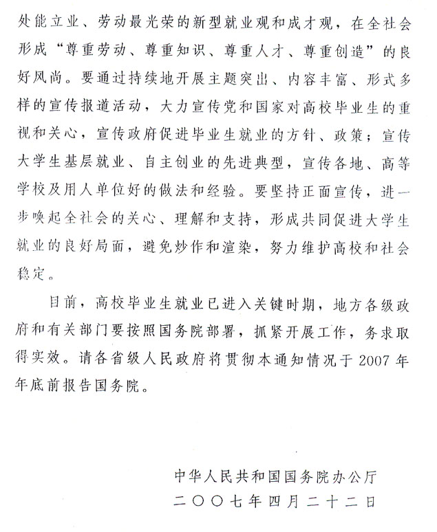 現(xiàn)將《國務院辦公廳關(guān)于切實做好2007年普通高等學校畢業(yè)生就業(yè)工作的通知》(國辦發(fā)〔2007〕26號)轉(zhuǎn)發(fā)給你們,經(jīng)省人民政府同意,結(jié)合我省實際,提出如下意見,請一并貫徹執(zhí)行。