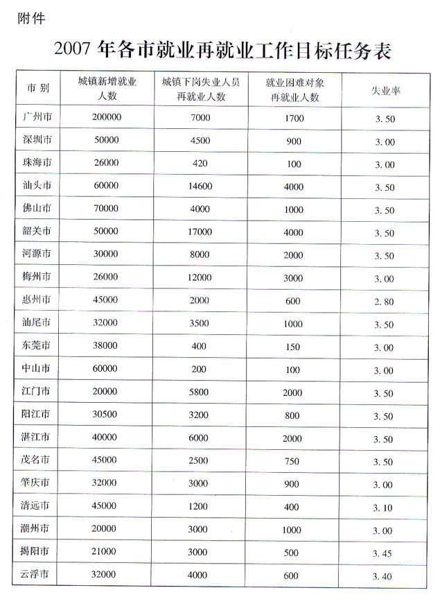 各地級以上市2007年就業(yè)再就業(yè)工作目標(biāo)任務(wù),見《2007年各市就業(yè)再就業(yè)工作目標(biāo)任務(wù)表》(附件)。