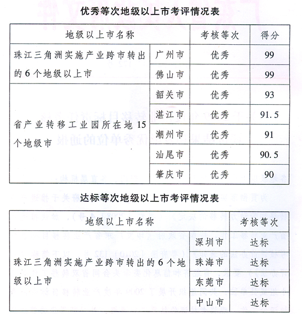 根據(jù)《考評辦法》有關(guān)規(guī)定,特對評定為優(yōu)秀等次的廣州、佛山、韶關(guān)、湛江、潮州、汕尾、肇慶等7個地級以上市政府和廣州(湛江)產(chǎn)業(yè)轉(zhuǎn)移工業(yè)園、東莞(韶關(guān))產(chǎn)業(yè)轉(zhuǎn)移工業(yè)園、中山(肇慶大旺)產(chǎn)業(yè)轉(zhuǎn)移工業(yè)園、深圳(潮州)產(chǎn)業(yè)轉(zhuǎn)移工業(yè)園等4個省產(chǎn)業(yè)轉(zhuǎn)移工業(yè)園予以全省通報表彰。