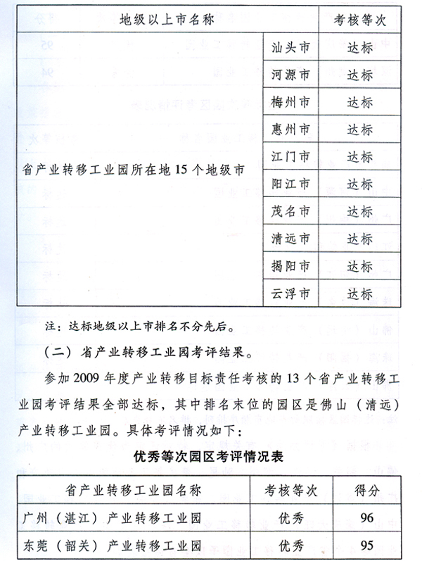 為貫徹落實《中共廣東省委廣東省人民政府關(guān)于推進產(chǎn)業(yè)轉(zhuǎn)移和勞動力轉(zhuǎn)移的決定》(粵發(fā)〔2008〕4號),加快推進我省產(chǎn)業(yè)轉(zhuǎn)移工作,按照省政府《印發(fā)廣東省產(chǎn)業(yè)轉(zhuǎn)移目標責(zé)任考核評價辦法的通知》(粵府函〔2010〕132號,以下簡稱《考評辦法》)要求,省經(jīng)濟和信息化委牽頭會同省雙轉(zhuǎn)移工作領(lǐng)導(dǎo)小組成員單位,共同組織開展了2009年度產(chǎn)業(yè)轉(zhuǎn)移目標責(zé)任考核評價工作。現(xiàn)將考核評價結(jié)果進行通報,并對獲得優(yōu)秀等次的地級以上市政府和省產(chǎn)業(yè)轉(zhuǎn)移工業(yè)園予以表彰。