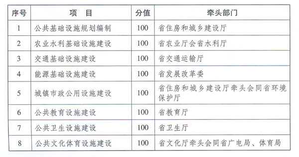印發(fā)廣東省公共基礎設施建設 考核辦法(試行)的通知 ? 各地級以上市人民政府,各縣(市、區(qū))人民政府,省政府各部門、各直屬機構: 《廣東省公共基礎設施建設考核辦法(試行)》業(yè)經(jīng)省人民政府同意,現(xiàn)印發(fā)給你們,請認真貫徹執(zhí)行。 ? ? 廣東省人民政府辦公廳 二〇一一年一月二十日 ? ? ? ? ? 廣東省公共基礎設施建設考核辦法 (試行) ? 為加強全省公共基礎設施建設考核工作,確保省委省政府有關決策部署落到實處,特制訂本考核辦法。 一、考核對象和內(nèi)容 ?。ㄒ唬┛己藢ο鬄楦魇?、縣政府。 ?。ǘ┛己藘?nèi)容為各市、縣政府落實《珠江三角洲地區(qū)改革發(fā)展規(guī)劃綱要(2008-2020年)》、《中共廣東省委廣東省人民政府關于促進粵東地區(qū)實現(xiàn)“五年大變化”的指導意見》(粵發(fā)〔2009〕14號)、《中共廣東省委廣東省人民政府關于促進粵西地區(qū)振興發(fā)展的指導意見》(粵發(fā)〔2009〕15號)、《中共廣東省委廣東省人民政府關于促進粵北山區(qū)跨越式發(fā)展的指導意見》(粵發(fā)〔2010〕5號)、《印發(fā)廣東省基本公共服務均等化規(guī)劃綱要(2009-2020年)的通知》(粵府〔2010〕153號)等文件提出的公共基礎設施建設目標任務和分階段工作任務,重點考核編制公共基礎設施規(guī)劃,建設農(nóng)業(yè)、水利、交通、能源等基礎設施,城鎮(zhèn)市政公用設施,公共教育、衛(wèi)生、文化、體育設施等方面工作目標和任務的年度完成情況。 二、考核指標和分值 考核指標分為公共基礎設施規(guī)劃編制、農(nóng)業(yè)基礎設施、水利基礎設施(含農(nóng)田水利設施)、交通基礎設施、能源基礎設施、城鎮(zhèn)市政公用設施、公共教育設施、公共衛(wèi)生設施、公共文化體育設施等九項指標(見下表),由表中各牽頭部門會同相關部門分別負責。