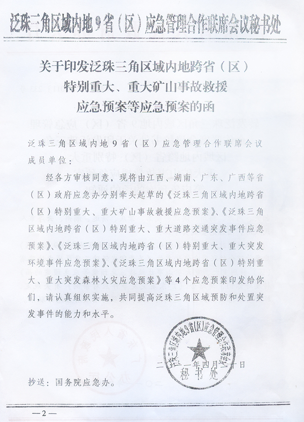 ? 轉(zhuǎn)發(fā)泛珠三角區(qū)域內(nèi)地9省(區(qū))應(yīng)急管理 合作聯(lián)席會(huì)議秘書(shū)處關(guān)于印發(fā)泛珠三角 區(qū)域內(nèi)地跨?。▍^(qū))特別重大、 重大礦山事故救援應(yīng)急預(yù)案 等應(yīng)急預(yù)案的函的通知 ? 韶關(guān)、河源、梅州、湛江、茂名、肇慶、清遠(yuǎn)、潮州、云浮市人民政府,省應(yīng)急委成員單位: 根據(jù)省政府領(lǐng)導(dǎo)同志意見(jiàn),現(xiàn)將泛珠三角區(qū)域內(nèi)地9?。▍^(qū))應(yīng)急管理合作聯(lián)席會(huì)議秘書(shū)處《關(guān)于印發(fā)泛珠三角區(qū)域內(nèi)地跨?。▍^(qū))特別重大、重大礦山事故救援應(yīng)急預(yù)案等應(yīng)急預(yù)案的函》轉(zhuǎn)發(fā)給你們,請(qǐng)結(jié)合《廣東省突發(fā)事件應(yīng)對(duì)條例》有關(guān)規(guī)定,抓好貫徹落實(shí)。執(zhí)行中遇到的問(wèn)題,請(qǐng)徑與省政府應(yīng)急辦聯(lián)系。 ? ? ? 廣東省人民政府辦公廳 二○一一年四月二十五日 ? ? ?