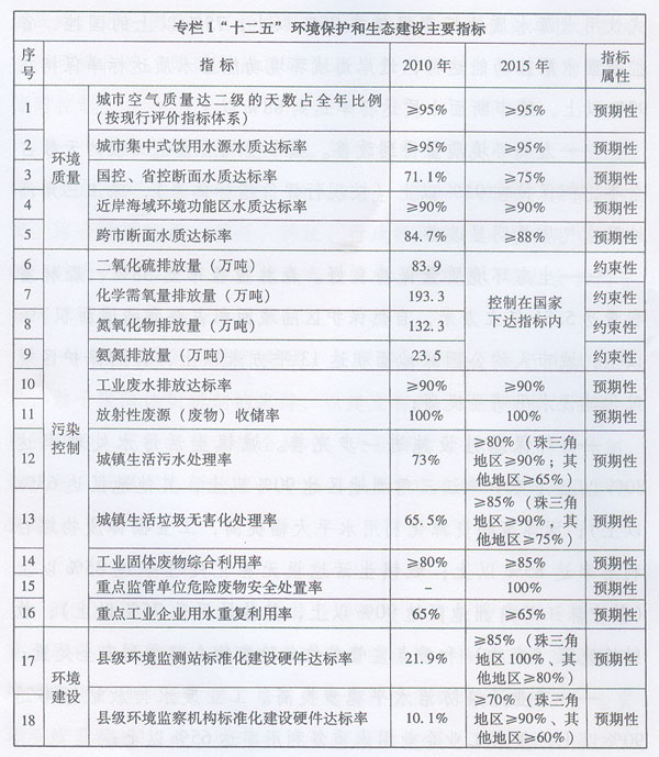 印發(fā)廣東省環(huán)境保護和生態(tài)建設(shè) “十二五”規(guī)劃的通知 ? 各地級以上市人民政府,各縣(市、區(qū))人民政府,省政府各部門、各直屬機構(gòu): 《廣東省環(huán)境保護和生態(tài)建設(shè)“十二五”規(guī)劃》業(yè)經(jīng)省人民政府同意,現(xiàn)印發(fā)給你們,請認真組織實施。實施中遇到的問題,請徑向省環(huán)境保護廳、發(fā)展改革委反映。 ? ? ? ? 廣東省人民政府辦公廳 二○一一年七月二十八日 ? ? ? ? ? 廣東省環(huán)境保護和生態(tài)建設(shè) “十二五”規(guī)劃 ? ? 目 錄 ? 一、現(xiàn)狀、機遇與挑戰(zhàn)………………………………………………(1) ?。ㄒ唬笆晃濉杯h(huán)保工作取得的成效………………………………(1) ?。ǘ笆濉杯h(huán)保工作面臨的機遇與挑戰(zhàn)………………………(4) 二、指導(dǎo)思想、原則及目標(biāo)…………………………………………(7) ?。ㄒ唬┲笇?dǎo)思想…………………………………………………………(7) (二)基本原則…………………………………………………………(7) (三)主要目標(biāo)…………………………………………………………(8) 三、強化環(huán)境調(diào)控,促進綠色發(fā)展…………………………………(11) ?。ㄒ唬┓謪^(qū)引導(dǎo),優(yōu)化產(chǎn)業(yè)布局………………………………………(11) (二)減排倒逼,促進產(chǎn)業(yè)結(jié)構(gòu)轉(zhuǎn)型升級……………………………(12) ?。ㄈ┚G色提升,構(gòu)建環(huán)境友好型產(chǎn)業(yè)體系…………………………(14) 四、加強綜合治理,改善環(huán)境質(zhì)量…………………………………(15) ?。ㄒ唬┙y(tǒng)籌管理,推進水環(huán)境質(zhì)量持續(xù)好轉(zhuǎn)…………………………(15) ?。ǘ┞?lián)防聯(lián)控,改善大氣環(huán)境質(zhì)量…………………………………(18) ?。ㄈ┤瘫O(jiān)管,加強重金屬污染綜合防治…………………………(22) ?。ㄋ模┨嵘芰?,確保固體廢物安全處置……………………………(24) ?。ㄎ澹娀芾恚纳坡暛h(huán)境質(zhì)量……………………………………(26) 五、加強農(nóng)村生態(tài)保護,構(gòu)建生態(tài)安全屏障………………………(26) ?。ㄒ唬┏青l(xiāng)統(tǒng)籌,提高農(nóng)村環(huán)境保護水平……………………………(26) ?。ǘ┰圏c示范,強化土壤環(huán)境保護…………………………………(28) ?。ㄈ┍SY(jié)合,構(gòu)筑生態(tài)安全格局…………………………………(29) 六、強化風(fēng)險防控,確保環(huán)境安全…………………………………(32) (一)強化重點污染源風(fēng)險防控………………………………………(32) ?。ǘ┍U虾伺c輻射環(huán)境安全…………………………………………(32) ?。ㄈ┘訌姯h(huán)境風(fēng)險應(yīng)急管理…………………………………………(33) 七、加強能力建設(shè),全面提升環(huán)境監(jiān)管水平………………………(34) ?。ㄒ唬┘訌姯h(huán)境監(jiān)測預(yù)警能力建設(shè)……………………………………(34) ?。ǘ┨嵘h(huán)境執(zhí)法監(jiān)督能力…………………………………………(36) ?。ㄈ┨岣吆伺c輻射安全監(jiān)管能力……………………………………(37) ?。ㄋ模┨嵘h(huán)境信息化水平……………………………………………(37) (五)加強環(huán)境宣教能力建設(shè)…………………………………………(38) 八、創(chuàng)新機制與政策,提升環(huán)境保護綜合管理水平 ……………(38) ?。ㄒ唬┨岣攮h(huán)保綜合決策與協(xié)調(diào)能力…………………………………(38) ?。ǘ┩七M環(huán)保法規(guī)體系建設(shè)…………………………………………(39) ?。ㄈ┙∪h(huán)境經(jīng)濟激勵機制…………………………………………(40) (四)提升科技支撐能力,推進環(huán)保產(chǎn)業(yè)發(fā)展………………………(41) ?。ㄎ澹娀姯h(huán)保意識,發(fā)揮環(huán)保社會監(jiān)督作用…………………(42) ?。┘訌姯h(huán)保合作交流………………………………………………(44) 九、實施重點工程,落實規(guī)劃任務(wù)…………………………………(45) 十、規(guī)劃實施保障 ……………………………………………………(45) ?。ㄒ唬┘訌娊M織領(lǐng)導(dǎo)……………………………………………………(45) (二)分解落實任務(wù)……………………………………………………(46) ?。ㄈ娀u估考核……………………………………………………(46) 附表1水污染防治重點工程……………………………………………(47) 附表2大氣污染防治重點工程…………………………………………(53) 附表3農(nóng)村環(huán)境保護重點工程…………………………………………(56) 附表4固體廢物處理處置重點工程……………………………………(59) 附表5生態(tài)建設(shè)重點工程………………………………………………(63) 附表6核與輻射安全保障重點工程……………………………………(67) 附表7重金屬污染防治重點工程………………………………………(68) 附表8環(huán)境監(jiān)管能力建設(shè)重點工程……………………………………(72) ? 一、現(xiàn)狀、機遇與挑戰(zhàn) ?。ㄒ唬笆晃濉杯h(huán)保工作取得的成效。 “十一五”期間,我