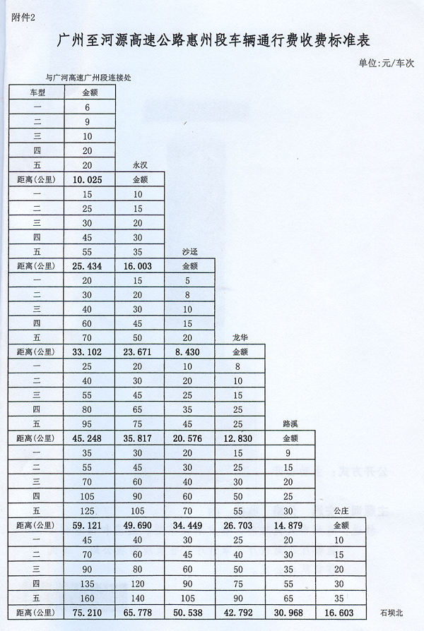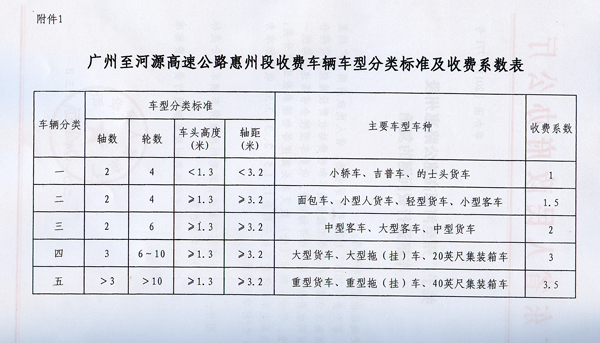 附件:1.廣州至河源高速公路惠州段收費(fèi)車輛車型分類標(biāo)準(zhǔn)及收費(fèi)系數(shù)表 2.廣州至河源高速公路惠州段車輛通行費(fèi)收費(fèi)標(biāo)準(zhǔn)表