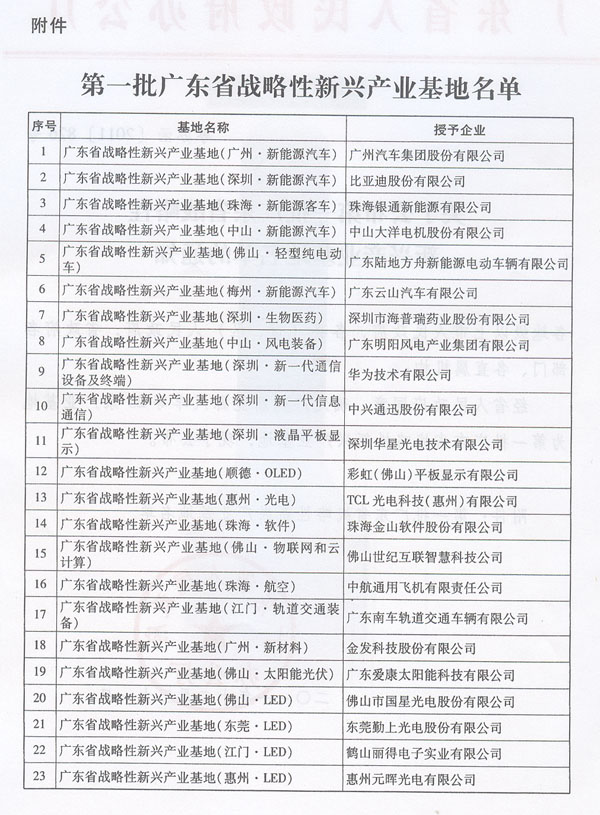 ? 關(guān)于公布第一批廣東省戰(zhàn)略性 新興產(chǎn)業(yè)基地名單的通知 ? 各地級以上市人民政府,各縣(市、區(qū))人民政府,省政府各部門、各直屬機(jī)構(gòu): 經(jīng)省人民政府同意,確定廣州新能源汽車等23家產(chǎn)業(yè)基地為第一批廣東省戰(zhàn)略性新興產(chǎn)業(yè)基地,現(xiàn)予公布。 ? 附件:第一批廣東省戰(zhàn)略性新興產(chǎn)業(yè)基地名單 ? ? ? ? 廣東省人民政府辦公廳 二○一一年十二月三十一日 ? ?