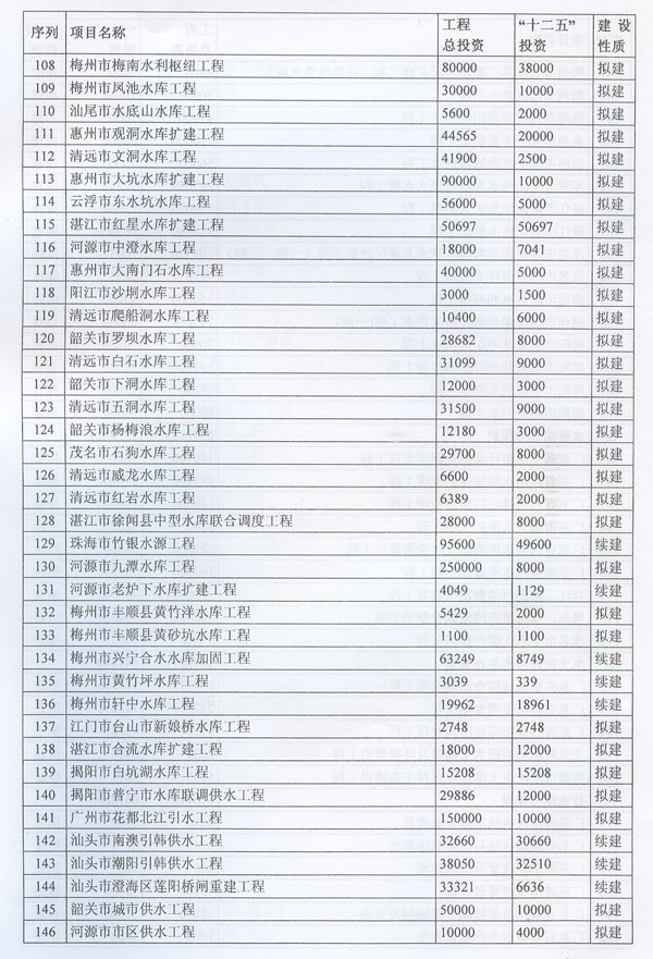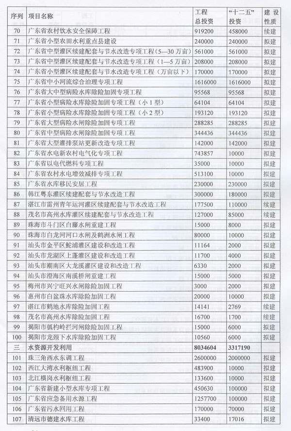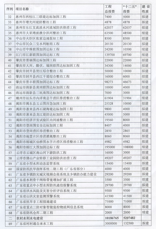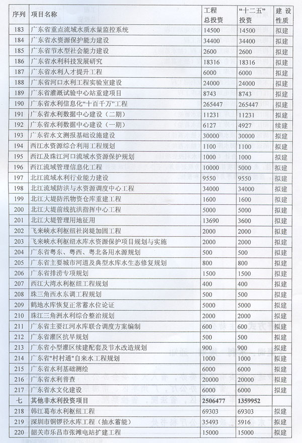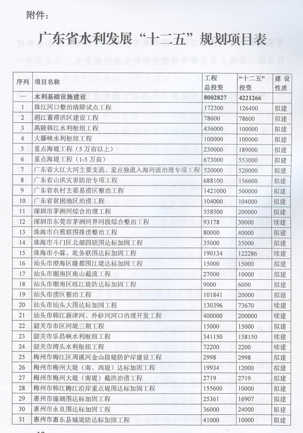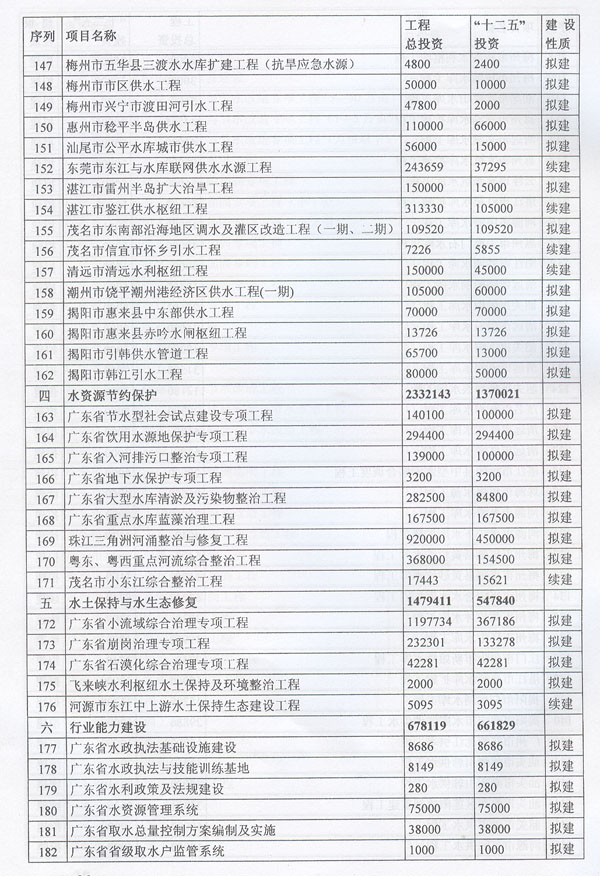 ? 印發(fā)廣東省水利發(fā)展“十二五”規(guī)劃的通知 ? 各地級以上市人民政府,各縣(市、區(qū))人民政府,省政府各部門、各直屬機構(gòu): 《廣東省水利發(fā)展“十二五”規(guī)劃》已經(jīng)省人民政府同意,現(xiàn)印發(fā)給你們,請認真貫徹實施。實施中遇到的問題,請徑向省水利廳、發(fā)展改革委反映。 ? ? ? ? 廣東省人民政府辦公廳二○一一年十二月二十九日 ? ? ? 廣東省水利發(fā)展“十二五”規(guī)劃 ? ? ? ? 目 錄 ? 一、現(xiàn)狀與形勢 …………………………………………………………(1) ?。ㄒ唬笆晃濉睍r期廣東水利發(fā)展成效顯著…………………………(1) ?。ǘ笆濉睍r期廣東水利發(fā)展形勢………………………………(2) 1.廣東水利跨越式發(fā)展面臨的挑戰(zhàn) ……………………………………(2) 2.廣東水利發(fā)展進入重要戰(zhàn)略機遇期 …………………………………(3) 二、指導思想、基本原則和規(guī)劃目標……………………………………(3) ?。ㄒ唬┲笇枷搿?) (二)基本原則……………………………………………………………(4) ?。ㄈ┮?guī)劃目標……………………………………………………………(5) 三、主要任務(wù)………………………………………………………………(6) ?。ㄒ唬┩晟妻r(nóng)村水利基礎(chǔ)設(shè)施……………………………………………(6) 1.突出加強農(nóng)田水利建設(shè) ………………………………………………(6) 2.繼續(xù)推進農(nóng)村飲水安全工程 …………………………………………(6) 3.開展農(nóng)村重點易澇區(qū)整治 ……………………………………………(7) 4.加強農(nóng)村水電與電氣化建 ……………………………………………(7) 5.推進水庫移民安居工程建設(shè) …………………………………………(7) ?。ǘ┘訌姺篮轶w系建設(shè)…………………………………………………(7) 1.完善主要江河防洪體系 ………………………………………………(7) 2.加強中小河流治理 ……………………………………………………(8) 3.加快推進“千里海堤加固達標工程” ………………………………(8) 4.繼續(xù)實施病險水庫水閘除險加固工程 ………………………………(8) 5.強化山洪災(zāi)害防治 ……………………………………………………(9) 6.強化非工程措施建 ……………………………………………………(9) ?。ㄈ﹥?yōu)化水資源配………………………………………………………(9) 1.加快建設(shè)水利樞紐及河庫水系連通工程 ……………………………(9) 2.加快建設(shè)調(diào)引提蓄水工程 ……………………………………………(10) 3.加快推進應(yīng)急備用水源及非常規(guī)水源建設(shè) …………………………(10) ?。ㄋ模┘訌娝Y源保護與節(jié)約……………………………………………(10) 1.加強重點飲用水水源地保護 …………………………………………(10) 2.加強水庫水資源保護 …………………………………………………(11) 3.加大地下水保護力度 …………………………………………………(11) 4.加強重點河道(涌)整治 ……………………………………………(11) 5.加強水土保持與生態(tài)修復 ……………………………………………(11) 6.全面推進節(jié)水型社會建設(shè) ……………………………………………(11) (五)實行最嚴格水資源管理制度………………………………………(12) 1.建立用水總量控制制度 ………………………………………………(12) 2.建立用水效率控制制度 ………………………………………………(12) 3.建立水功能區(qū)限制納污制度 …………………………………………(13) ?。┥罨w制機制改革……………………………………………(13) 1.深化水管體制改革 ……………………………………………………(13) 2.加強水利法制建設(shè) ……………………………………………………(13) 3.大力提升水利行業(yè)能力 ………………………………………………(13) 4.提高水利應(yīng)急管理能力 ………………………………………………(14) 5.強化水行政執(zhí)法能力 …………………………………………………(14) 6.推動水文化建設(shè) ………………………………………………………(15) 四、保障措施………………………………………………………………(15) ?。ㄒ唬┘訌娊M織領(lǐng)導………………………………………………………(15) (二)加大資金投入………………………………………………………(15) ?。ㄈ┛茖W制訂規(guī)劃………………………………………………………(15) (四)加強隊伍建設(shè)………………………………………………………(16) ?。ㄎ澹娀O(jiān)督檢查………………………………………………………(16) ?。┲匾暛h(huán)境保護………………………………………………………(16) 附件:廣東省水利發(fā)展“十二五”規(guī)劃項目表…………………………(18) ? ? ? 加快水利改革發(fā)展事關(guān)農(nóng)業(yè)農(nóng)村發(fā)展,事關(guān)防洪安全、供水安全、糧食安全和生態(tài)安全,事關(guān)經(jīng)濟社會發(fā)展全局。根據(jù)中央水利工作會議、《中共中央國務(wù)院關(guān)于加快水利改革發(fā)展的決定》(中發(fā)〔