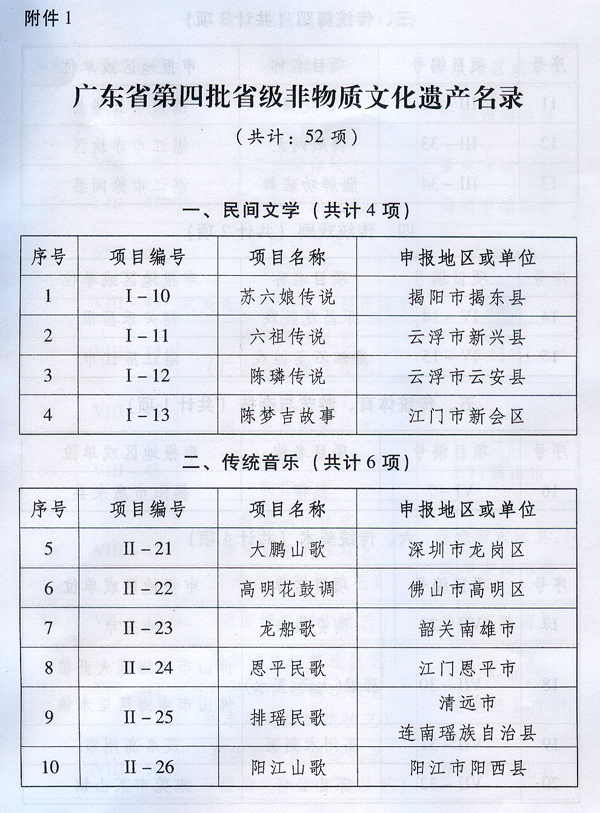 關(guān)于批準并公布廣東省第四批省級非物質(zhì) 文化遺產(chǎn)名錄的通知