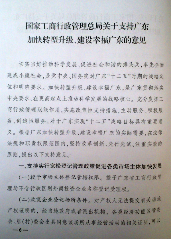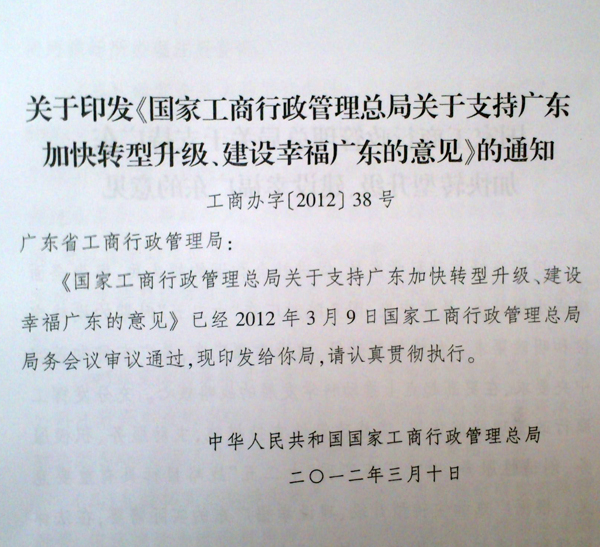 轉(zhuǎn)發(fā)國(guó)家工商總局關(guān)于支持廣東加快轉(zhuǎn)型升級(jí) 建設(shè)幸福廣東意見(jiàn)的通知