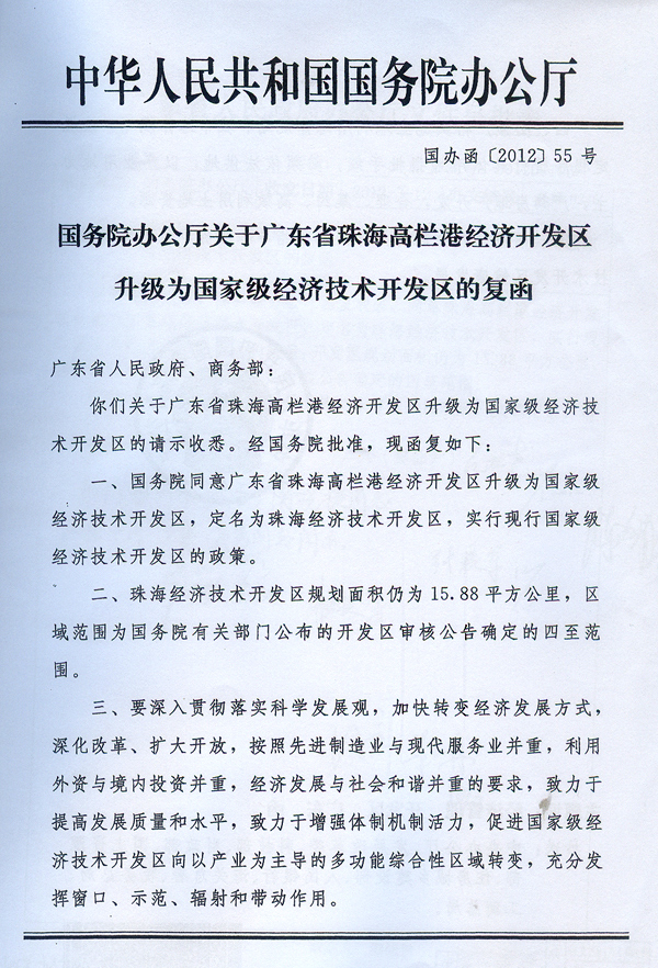 珠海市人民政府: 現(xiàn)將《國(guó)務(wù)院辦公廳關(guān)于廣東省珠海高欄港經(jīng)濟(jì)開發(fā)區(qū)升級(jí)為國(guó)家級(jí)經(jīng)濟(jì)技術(shù)開發(fā)區(qū)的復(fù)函》(國(guó)辦函〔2012〕55號(hào)) 轉(zhuǎn)發(fā)給你們,請(qǐng)按照辦理。