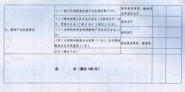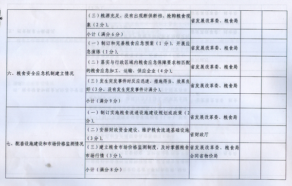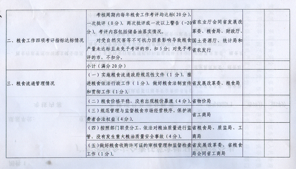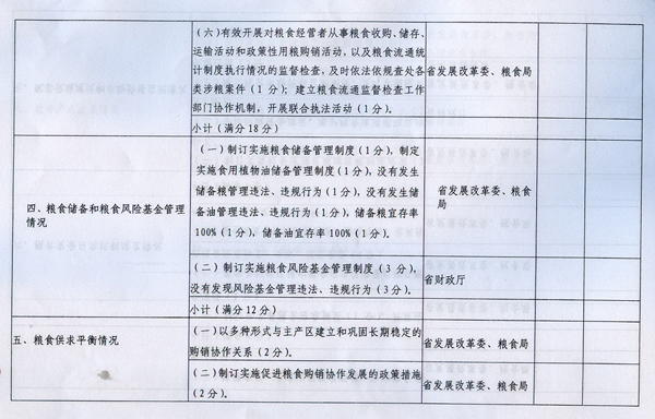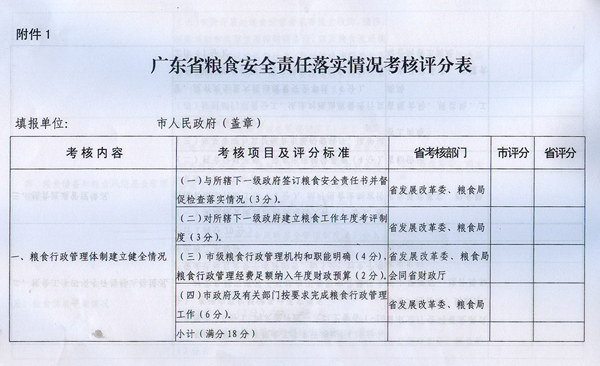 ?。ǘ┰u審。由省發(fā)展改革委、糧食局組織省財政廳、國土資源廳、農(nóng)業(yè)廳、物價局、工商局、質(zhì)監(jiān)局和省農(nóng)發(fā)行等單位按照各自職責就本單位負責考核的內(nèi)容提出書面意見,并對各市填報的《廣東省糧食安全責任落實情況考核評分表》進行復評考核。