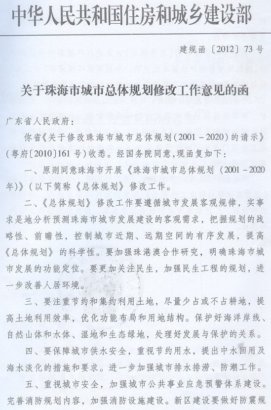現(xiàn)將住房和城鄉(xiāng)建設(shè)部《關(guān)于珠海市城市總體規(guī)劃修改工作意見(jiàn)的函》(建規(guī)函〔2012〕73號(hào))轉(zhuǎn)發(fā)給你們,請(qǐng)遵照實(shí)施。