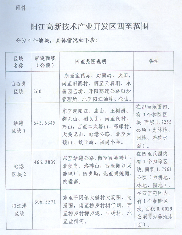 陽江市人民政府: 陽府〔2011〕22號請示收悉。經(jīng)省人民政府同意,現(xiàn)函復如下: 一、省人民政府同意認定廣東陽江工業(yè)園區(qū)和廣東陽江港經(jīng)濟開發(fā)區(qū)內(nèi)16764755公頃區(qū)域為省級高新技術產(chǎn)業(yè)開發(fā)區(qū),定名為陽江高新技術產(chǎn)業(yè)開發(fā)區(qū),實行現(xiàn)行省級高新技術產(chǎn)業(yè)開發(fā)區(qū)政策。 二、陽江高新技術產(chǎn)業(yè)開發(fā)區(qū)區(qū)域范圍在國家有關部門公告確定的廣東陽江工業(yè)園區(qū)和廣東陽江港經(jīng)濟開發(fā)區(qū)四至范圍內(nèi),分為4個區(qū)塊(四至范圍詳見附件)。 三、陽江高新技術產(chǎn)業(yè)開發(fā)區(qū)必須嚴格實施土地利用總體規(guī)劃和城市總體規(guī)劃,按規(guī)定履行具體用地報批手續(xù),依法供地,切實做到合理、集約、高效利用土地資源。 四、陽江高新技術產(chǎn)業(yè)開發(fā)區(qū)要加快發(fā)展高新技術產(chǎn)業(yè)和高附加值服務業(yè),突出主導產(chǎn)業(yè),延伸優(yōu)化產(chǎn)業(yè)鏈條,進一步集聚自主創(chuàng)新資源,提升產(chǎn)業(yè)競爭力和自主創(chuàng)新能力,充分發(fā)揮輻射和示范帶動作用。 五、你市要加強指導和服務,促進陽江高新技術產(chǎn)業(yè)開發(fā)區(qū)健康發(fā)展。 ? 附件:陽江高新技術產(chǎn)業(yè)開發(fā)區(qū)四至范圍