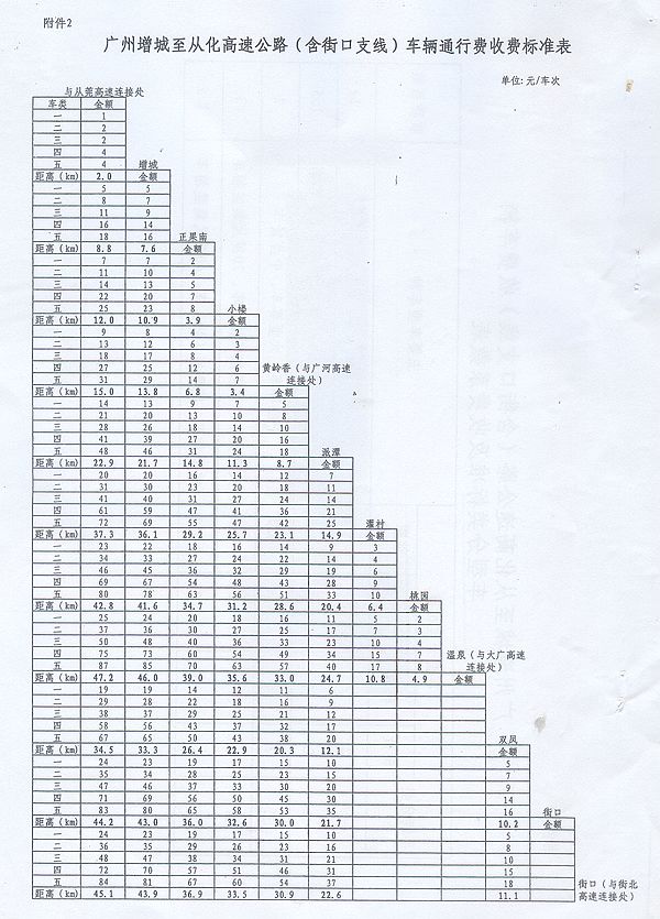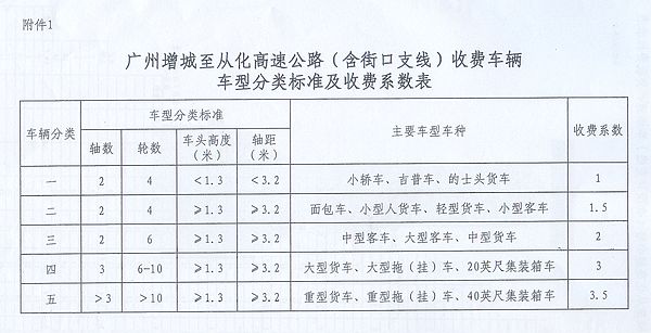 省交通運輸廳、物價局: 粵交費〔2012〕671號請示收悉。省人民政府同意廣州增城至從化高速公路(含街口支線)交工驗收通車和收費站收費設施經(jīng)驗收符合省聯(lián)網(wǎng)收費技術要求后開始收費,收費車型按全省高速公路統(tǒng)一標準,即按車輛軸(輪)數(shù)及車頭高度等物理參數(shù)進行分類,一至五類車的收費系數(shù)分別為1、15、2、3、35;主線起點至坳背互通立交段收費標準為0.6元/標準車公里,坳背互通立交至衛(wèi)東互通立交段和街口支線收費標準為0.45元/標準車公里。 ? 附件:1.廣州增城至從化高速公路(含街口支線)收費車輛車型分類標準及收費系數(shù)表 2.廣州增城至從化高速公路(含街口支線)車輛通行費收費標準表 ? 省府辦公廳 2012年7月24日 ? ? ? |