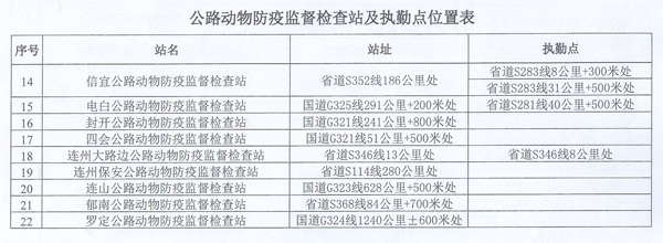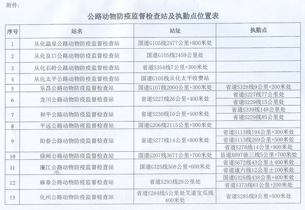 ? 廣東省人民政府辦公廳關(guān)于同意延長(zhǎng) 從化溫泉等22個(gè)公路動(dòng)物防疫 監(jiān)督檢查站設(shè)站時(shí)間的復(fù)函 ? 廣州、韶關(guān)、河源、梅州、陽(yáng)江、湛江、茂名、肇慶、清遠(yuǎn)、云浮市人民政府,省農(nóng)業(yè)廳: 穗府報(bào)〔2012〕129號(hào)、韶府請(qǐng)〔2012〕26號(hào)、河府〔2012〕54號(hào)、梅市府報(bào)〔2012〕45號(hào)、陽(yáng)府〔2012〕47號(hào)、湛府〔2012〕50號(hào)、茂府〔2012〕52號(hào)、肇府報(bào)〔2012〕33號(hào)、清府〔2012〕51號(hào)、云府〔2012〕60號(hào)文收悉。省人民政府同意延長(zhǎng)從化溫泉、從化良口、從化石嶺、從化太平、樂(lè)昌、龍川、和平、平遠(yuǎn)、陽(yáng)春、徐聞、廉江、麻章、化州、信宜、電白、封開、四會(huì)、連州大路邊、連州保安、連山、郁南、羅定公路動(dòng)物防疫監(jiān)督檢查站的設(shè)站時(shí)間。上述各檢查站、執(zhí)勤點(diǎn)的設(shè)站(點(diǎn))期限均至2014年9月30日24時(shí)止。檢查站與執(zhí)勤點(diǎn)不得同時(shí)上崗執(zhí)法,執(zhí)法人員不得超越檢查站或執(zhí)勤點(diǎn)進(jìn)行流動(dòng)檢查。請(qǐng)切實(shí)做好監(jiān)督管理工作,確保依法檢查、文明執(zhí)法,嚴(yán)防公路“三亂”行為發(fā)生。 ? 附件:公路動(dòng)物防疫監(jiān)督檢查站及執(zhí)勤點(diǎn)位置表 ? ? ? ? 省府辦公廳 2012年9月26日 ? ?