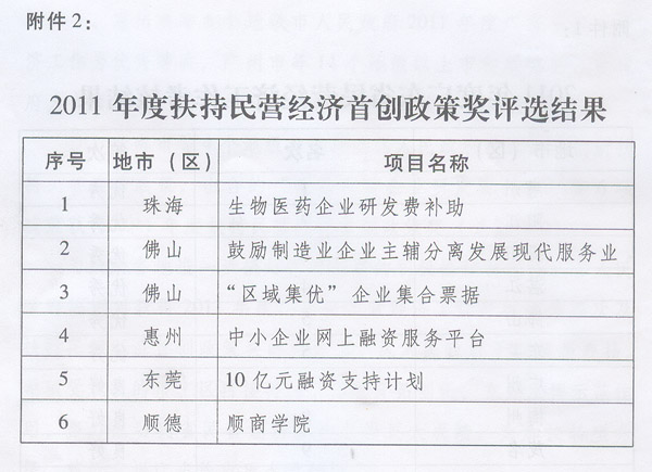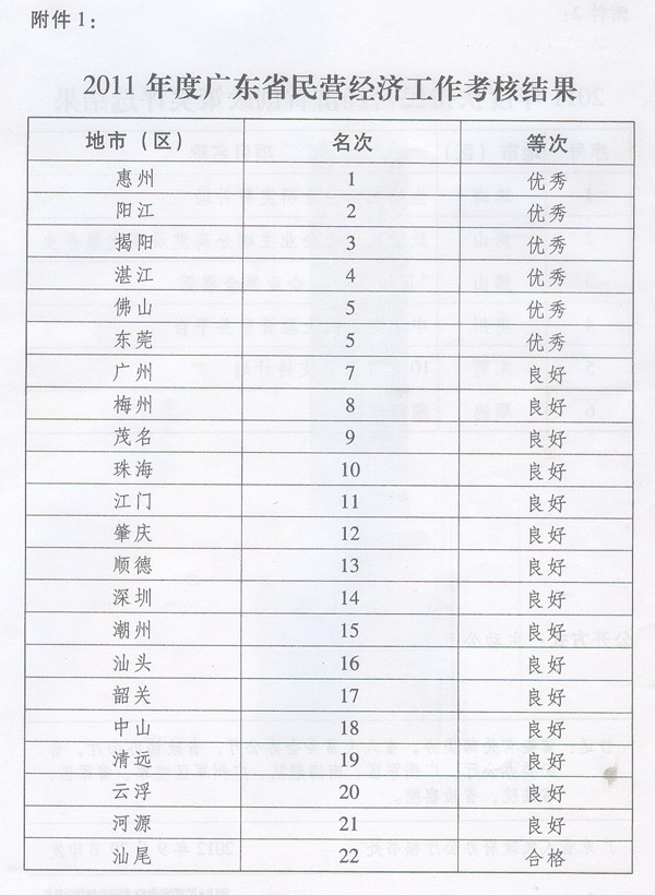 ? 廣東省人民政府辦公廳關(guān)于2011年度 廣東省民營經(jīng)濟工作考核及扶持民營經(jīng)濟 首創(chuàng)政策獎評選結(jié)果的通報 ? 各地級以上市人民政府,順德區(qū)人民政府,省政府各部門、各直屬機構(gòu): 按照《中共廣東省委廣東省人民政府關(guān)于促進民營經(jīng)濟發(fā)展上水平的意見》(粵發(fā)〔2010〕16號)要求,省經(jīng)濟和信息化委會同省促進民營經(jīng)濟發(fā)展聯(lián)席會議成員單位對各地級以上市和順德區(qū)人民政府2011年度民營經(jīng)濟工作進行了考核,并對扶持民營經(jīng)濟首創(chuàng)政策獎進行了評選,現(xiàn)就考核及評選結(jié)果通報如下:一、惠州市等6個地級市人民政府2011年度廣東省民營經(jīng)濟工作為優(yōu)秀等次,廣州市等14個地級以上市和順德區(qū)人民政府為良好等次,汕尾市人民政府為合格等次(見附件1)。 二、珠海市等4個地級市和順德區(qū)人民政府積極探索創(chuàng)新扶持民營經(jīng)濟政策,出臺的“生物醫(yī)藥企業(yè)研發(fā)費補助”等6項政策獲得2011年度扶持民營經(jīng)濟首創(chuàng)政策獎(見附件2)。 為鼓勵各地進一步搞好民營經(jīng)濟的積極性和創(chuàng)造性,省人民政府決定對獲得2011年度廣東省民營經(jīng)濟工作考核優(yōu)秀等次及扶持民營經(jīng)濟首創(chuàng)政策獎的有關(guān)市、區(qū)人民政府予以通報表揚。希望受表揚的市、區(qū)再接再厲,不斷開拓創(chuàng)新,充分發(fā)揮示范作用,努力推動我省民營經(jīng)濟工作取得更大成績,為加快轉(zhuǎn)型升級、建設(shè)幸福廣東作出更大貢獻! ? 附件:1.2011年度廣東省民營經(jīng)濟工作考核結(jié)果 2.2011年度扶持民營經(jīng)濟首創(chuàng)政策獎評選結(jié)果 ? ? ? ? 廣東省人民政府辦公廳 2012年9月28日 ? ? ? ?