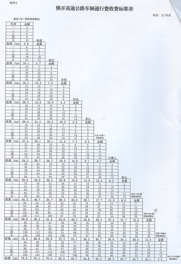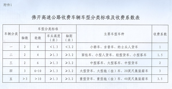 ? 廣東省人民政府辦公廳關(guān)于佛開高速公路 車輛通行費有關(guān)問題的復(fù)函 ? 省交通運輸廳、物價局: 粵交費〔2012〕1220號請示收悉。省人民政府同意佛開高速公路謝邊至三堡段改擴建工程交工驗收通車和收費站收費設(shè)施經(jīng)驗收符合省聯(lián)網(wǎng)收費技術(shù)要求后,佛開高速公路按全省高速公路統(tǒng)一標(biāo)準(zhǔn)進行收費。收費車型按車輛軸(輪)數(shù)及車頭高度等物理參數(shù)進行分類,一至五類車的收費系數(shù)分別為1、1.5、2、3、3.5;三堡至開平段收費標(biāo)準(zhǔn)為0.45元/標(biāo)準(zhǔn)車公里,謝邊至三堡段收費標(biāo)準(zhǔn)為0.6元/標(biāo)準(zhǔn)車公里。 ? 附件:1.佛開高速公路收費車輛車型分類標(biāo)準(zhǔn)及收費系數(shù)表 2.佛開高速公路車輛通行費收費標(biāo)準(zhǔn)表 ? ? ? 省府辦公廳 2012年12月18日 ? ? ?