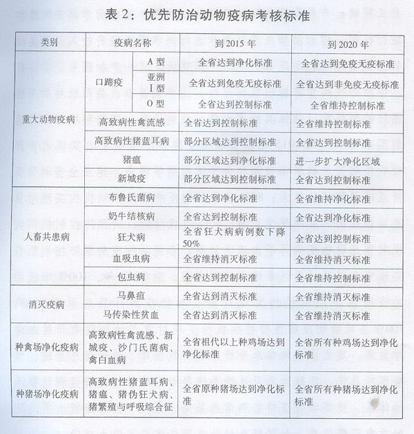 (二)防治目標(biāo)。到2020年,形成與全面建設(shè)小康社會(huì)相適應(yīng),有效保障養(yǎng)殖業(yè)生產(chǎn)安全、動(dòng)物產(chǎn)品質(zhì)量安全和公共衛(wèi)生安全的動(dòng)物疫病綜合防治能力??谔阋?、高致病性禽流感等16種優(yōu)先防治動(dòng)物疫?。ū?)達(dá)到規(guī)劃設(shè)定的考核標(biāo)準(zhǔn)(表2),生豬、家禽、牛、羊發(fā)病率分別下降到5%、6%、4%、3%以下,動(dòng)物發(fā)病率、死亡率和公共衛(wèi)生風(fēng)險(xiǎn)顯著降低。牛海綿狀腦病、非洲豬瘟等13種重點(diǎn)防范的外來(lái)動(dòng)物疫?。ū?)傳入和擴(kuò)散風(fēng)險(xiǎn)有效降低,防范和處置能力明顯提高。鴨瘟、小鵝瘟、豬乙型腦炎等動(dòng)物疫病防控工作得到切實(shí)加強(qiáng)。