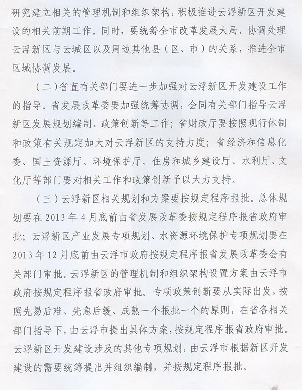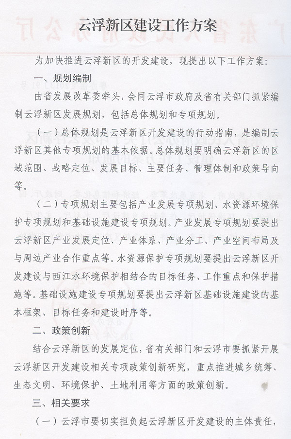 廣東省人民政府辦公廳關(guān)于印發(fā)云浮新區(qū) 建設(shè)工作方案的通知? 經(jīng)省人民政府同意,現(xiàn)將《云浮新區(qū)建設(shè)工作方案》印發(fā)給你們,請認(rèn)真貫徹執(zhí)行。? ? ? ? 省府辦公廳 2013年3月1日