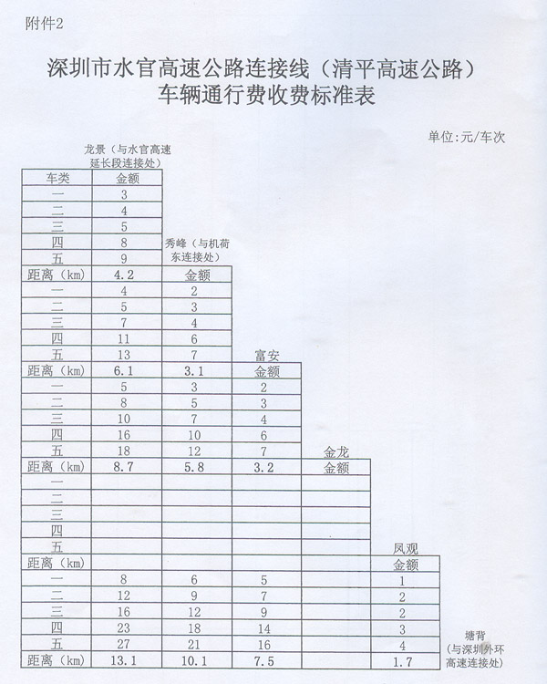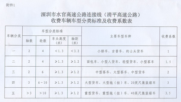 ? 廣東省人民政府辦公廳關(guān)于深圳水官高速 公路連接線(清平高速公路)車輛 通行費(fèi)有關(guān)問題的復(fù)函 省交通運(yùn)輸廳、物價(jià)局: 粵交費(fèi)〔2013〕597號(hào)請(qǐng)示收悉。省人民政府同意深圳水官高速公路連接線(清平高速公路)交工驗(yàn)收通車和收費(fèi)站收費(fèi)設(shè)施經(jīng)驗(yàn)收符合省聯(lián)網(wǎng)收費(fèi)技術(shù)要求后開始收費(fèi),收費(fèi)車型按全省高速公路統(tǒng)一標(biāo)準(zhǔn),即按車輛軸(輪)數(shù)及車頭高度等物理參數(shù)進(jìn)行分類,一至五類車的收費(fèi)系數(shù)分別為1、1.5、2、3、3.5;收費(fèi)標(biāo)準(zhǔn)按0.6元/標(biāo)準(zhǔn)車公里執(zhí)行。