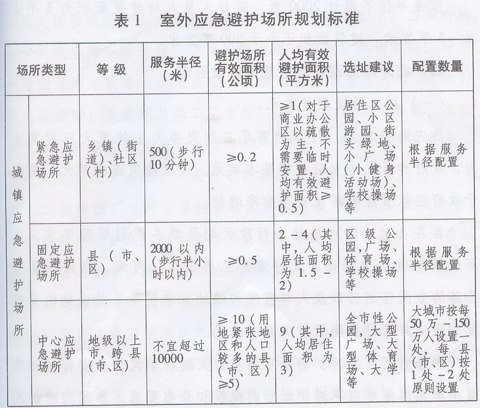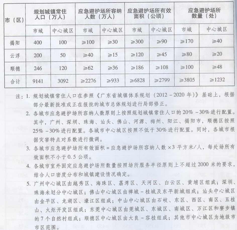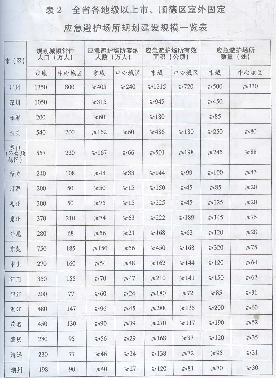 2.室內(nèi)應(yīng)急避護(hù)場(chǎng)所規(guī)劃標(biāo)準(zhǔn)。 服務(wù)半徑不超過(guò)2000米,避護(hù)人員人均建筑面積為3平方米-5平方米,建筑面積不小于500平方米。 四、室外應(yīng)急避護(hù)場(chǎng)所規(guī)劃建設(shè)要求 (一)建立防災(zāi)避護(hù)單元。 防災(zāi)避護(hù)單元,可作為常見(jiàn)自然災(zāi)害為主的重大災(zāi)害發(fā)生時(shí),政府和居民防災(zāi)避護(hù)的基本單元。設(shè)置防災(zāi)避護(hù)單元,有利于政府組織管理和居民安全有序避護(hù)。 各縣(市、區(qū))要結(jié)合行政區(qū)劃及城鄉(xiāng)規(guī)劃管理要求,以鄉(xiāng)鎮(zhèn)(街道)為基礎(chǔ),充分考慮主要山體、河流、鐵路、高速公路的分隔作用,以及人口密度和綠地、學(xué)校等公共設(shè)施的分布建立固定應(yīng)急避護(hù)場(chǎng)所防災(zāi)避護(hù)單元。 室外固定應(yīng)急避護(hù)場(chǎng)所可結(jié)合防災(zāi)避護(hù)單元統(tǒng)一安排,防災(zāi)避護(hù)單元內(nèi)室外應(yīng)急避護(hù)場(chǎng)所的規(guī)模和分布要滿足單元內(nèi)避護(hù)人員的避護(hù)需求。未納入防災(zāi)避護(hù)單元的部分偏遠(yuǎn)、零散居民點(diǎn)可由鄰近單元提供應(yīng)急避護(hù)。 (二)選址要求。 室外應(yīng)急避護(hù)場(chǎng)所的建設(shè)選址需要符合以下要求: 1.安全性。選址要避開地震斷裂帶和可能發(fā)生地質(zhì)災(zāi)害的地區(qū),遠(yuǎn)離水庫(kù)泄洪區(qū)、低洼地易積水地區(qū),以及高壓走廊、次高壓以上燃?xì)夤艿馈⒊善酚洼斔凸艿?、大型油氣及其他危險(xiǎn)倉(cāng)儲(chǔ)區(qū)、大型化工園區(qū)等危險(xiǎn)設(shè)施的影響范圍,高層建筑物、高聳構(gòu)筑物的垮塌范圍。室外應(yīng)急避護(hù)場(chǎng)所距次生災(zāi)害危險(xiǎn)源的距離,要滿足國(guó)家現(xiàn)行重大危險(xiǎn)源和防火有關(guān)標(biāo)準(zhǔn)規(guī)范要求。四周有次生火災(zāi)或爆炸危險(xiǎn)源時(shí),要設(shè)置防火隔離帶或防火樹林帶。場(chǎng)所與周圍易燃建筑等一般地震次生災(zāi)源之間要設(shè)置不小于30米的防火安全帶;與易燃易爆工廠倉(cāng)庫(kù)、供氣廠、儲(chǔ)氣站等重大次生火災(zāi)或爆炸危險(xiǎn)源距離不小于1000米。應(yīng)急避護(hù)場(chǎng)所不得設(shè)在可能發(fā)生非煤礦山尾礦庫(kù)潰壩事故波及的范圍內(nèi)。 2.便捷性。室外應(yīng)急避護(hù)場(chǎng)所的設(shè)置要考慮人口密度分布、按照服務(wù)半徑要求進(jìn)行均衡布局,優(yōu)先考慮公園、廣場(chǎng)、體育場(chǎng)等現(xiàn)有公共設(shè)施資源。要選址于周邊道路條件較好的用地,便于受災(zāi)群眾的快速疏散轉(zhuǎn)移。緊急應(yīng)急避護(hù)場(chǎng)所要保證步行可快速到達(dá);固定應(yīng)急避護(hù)場(chǎng)所要保證車行和步行均可便捷到達(dá);中心應(yīng)急避護(hù)場(chǎng)所和區(qū)域性應(yīng)急避護(hù)場(chǎng)所除保證車行和步行可達(dá)性外,要確保與城市陸、海、空交通系統(tǒng)有便捷交通聯(lián)系。 3.合法性。縣級(jí)以上文物保護(hù)單位的公園等場(chǎng)所作為應(yīng)急避護(hù)場(chǎng)所時(shí),要?jiǎng)澏ū茏o(hù)區(qū)域,有關(guān)避護(hù)設(shè)施建設(shè)不得破壞文物及其環(huán)境。相關(guān)設(shè)施要盡量在文物保護(hù)單位的建設(shè)控制地帶之外。如因條件所限制需要設(shè)于建筑控制地帶之內(nèi)的,要依照文物保護(hù)的相關(guān)法律法規(guī)按程序報(bào)批。 (三)規(guī)劃要求。 1.緊急應(yīng)急避護(hù)場(chǎng)所規(guī)劃要求。 ?。?)緊急應(yīng)急避護(hù)場(chǎng)所要按照?qǐng)鏊?wù)范圍內(nèi)的晝夜最大人口峰值進(jìn)行設(shè)置。 ?。?)緊急應(yīng)急避護(hù)場(chǎng)所以城鄉(xiāng)開敞空間為主,可利用城鄉(xiāng)中小學(xué)校操場(chǎng)、露天體育場(chǎng)所、社區(qū)(村)公園,露天停車場(chǎng)、小廣場(chǎng)、街頭綠地、農(nóng)村曬谷場(chǎng),以及地勢(shì)較高、地質(zhì)條件穩(wěn)定的空地等。 ?。?)城中村地區(qū)和高密度的商業(yè)、辦公區(qū),要通過(guò)“三舊”(舊城鎮(zhèn)、舊村莊、舊廠房)改造和城市更新增加綠地廣場(chǎng)、停車場(chǎng)等設(shè)置緊急應(yīng)急避護(hù)場(chǎng)所。 2.固定應(yīng)急避護(hù)場(chǎng)所規(guī)劃要求。 (1)以防災(zāi)避護(hù)單元為單位,應(yīng)急避護(hù)場(chǎng)所容納人數(shù)原則上按照規(guī)劃城鎮(zhèn)常住人口的20%-30%進(jìn)行配置。城市中心城區(qū)要按照不低于規(guī)劃城鎮(zhèn)常住人口的30%進(jìn)行配置。到2020年,全省固定應(yīng)急避護(hù)場(chǎng)所不少于3805處,容納人數(shù)不少于2276萬(wàn)人,有效面積不少于6828公頃。各地級(jí)以上市、順德區(qū)固定應(yīng)急避護(hù)場(chǎng)所規(guī)劃建設(shè)規(guī)模詳見(jiàn)表2。 表2全省各地級(jí)以上市、順德區(qū)室外固定 應(yīng)急避護(hù)場(chǎng)所規(guī)劃建設(shè)規(guī)模一覽表 ?