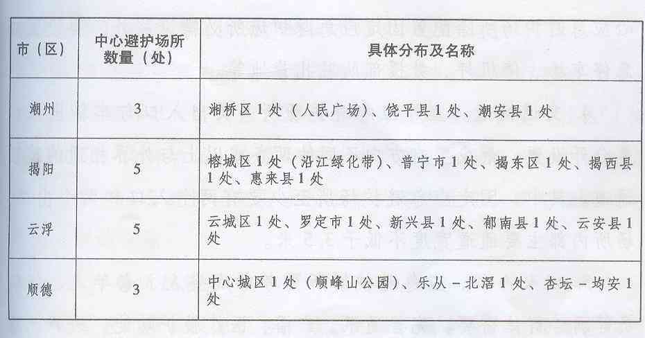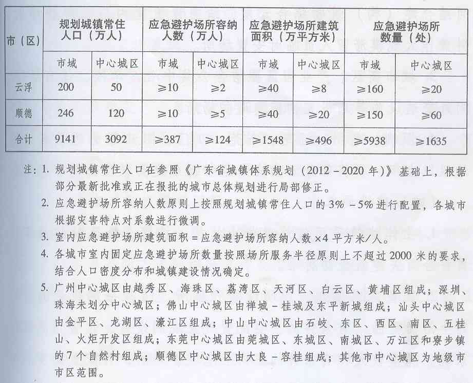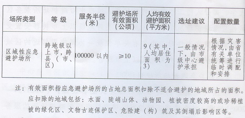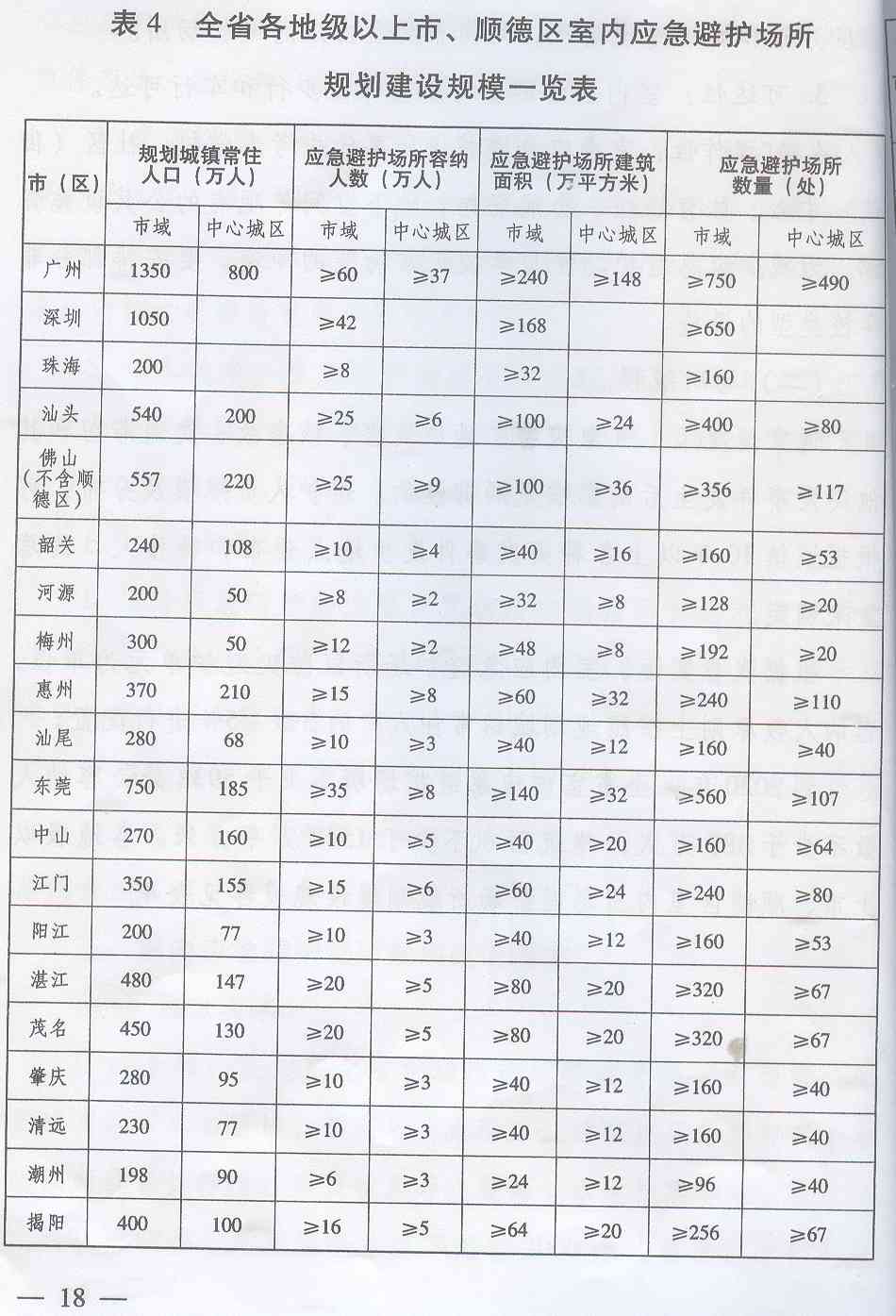 (四)建設(shè)要求。 1.科學(xué)選址。應(yīng)急避護(hù)場(chǎng)所要避開可能發(fā)生各類地質(zhì)災(zāi)害以及次生災(zāi)害的地區(qū);遠(yuǎn)離水庫(kù)泄洪區(qū)、洪水泛濫區(qū)、低洼地易積水地區(qū);周邊建筑要滿足抗震、防風(fēng)等防災(zāi)要求,并預(yù)留防護(hù)距離。所有應(yīng)急避護(hù)場(chǎng)所建設(shè)要進(jìn)行嚴(yán)格的場(chǎng)所安全性評(píng)價(jià),尤其要根據(jù)其應(yīng)對(duì)災(zāi)種進(jìn)行針對(duì)性的安全評(píng)價(jià),并根據(jù)評(píng)價(jià)結(jié)果采取必要的防護(hù)措施或選擇其他替代場(chǎng)所。 2.分區(qū)合理。工程處理后地形坡度不宜大于7度,植被要以疏林、草地為主,易于搭建帳篷及臨時(shí)建筑,適宜根據(jù)承擔(dān)功能劃定棚宿區(qū)、應(yīng)急指揮區(qū)、救援隊(duì)伍駐扎區(qū)、應(yīng)急醫(yī)療區(qū)、物資儲(chǔ)備區(qū)等功能分區(qū)。 3.配套齊全。應(yīng)急避護(hù)場(chǎng)所要配置指揮管理、應(yīng)急供水、供電、廁所、消防、排污、垃圾儲(chǔ)運(yùn)、醫(yī)療救護(hù)及防疫、物資儲(chǔ)備、洗浴、信息發(fā)布等設(shè)施,必要時(shí),要增設(shè)氣象觀測(cè)設(shè)施。中心應(yīng)急避護(hù)場(chǎng)所除配置固定應(yīng)急避護(hù)場(chǎng)所必需設(shè)施外,要設(shè)置應(yīng)急停車場(chǎng)、停機(jī)坪、救援部隊(duì)駐扎營(yíng)地等。 4.交通暢通。室外應(yīng)急避護(hù)場(chǎng)所人員出入口與車輛出入口要分開設(shè)置,最少要有方向不同的兩條或以上與外界相通的疏散通道。其中,固定應(yīng)急避護(hù)場(chǎng)所至少要有兩個(gè)入口和兩個(gè)出口,場(chǎng)所內(nèi)部主要通道寬度不低于35米。 5.以人為本。應(yīng)急避護(hù)場(chǎng)所要考慮殘疾人、老年人、傷病員等弱勢(shì)群體需要,完善通訊、廣播、醫(yī)療救護(hù)功能,進(jìn)行無(wú)障礙設(shè)計(jì),如坡道化設(shè)計(jì)、安排無(wú)障礙廁位等。 (五)標(biāo)識(shí)系統(tǒng)。 1.室外應(yīng)急避護(hù)場(chǎng)所要設(shè)置場(chǎng)所內(nèi)部指示標(biāo)志和場(chǎng)所周邊指示標(biāo)志。標(biāo)志樣式、顏色等內(nèi)容詳見(jiàn)附件2。場(chǎng)所周邊指示標(biāo)志要標(biāo)明場(chǎng)所名稱和類型。 2.室外應(yīng)急避護(hù)場(chǎng)所出入口等位置,要標(biāo)明應(yīng)急避護(hù)場(chǎng)所適用的災(zāi)害類型及所承擔(dān)的主要功能。室外固定應(yīng)急避護(hù)場(chǎng)所要繪制責(zé)任區(qū)域分布圖和內(nèi)部功能分區(qū)圖。 五、室內(nèi)應(yīng)急避護(hù)場(chǎng)所規(guī)劃建設(shè)要求 (一)選址要求。 1.安全性:室內(nèi)應(yīng)急避護(hù)場(chǎng)所選址要避開地震斷裂帶、地質(zhì)災(zāi)害區(qū)、內(nèi)澇區(qū)域,遠(yuǎn)離各類危險(xiǎn)源;建筑抗風(fēng)等級(jí)要高于本地風(fēng)荷載設(shè)計(jì)標(biāo)準(zhǔn);建筑抗震等級(jí)要高于本地抗震標(biāo)準(zhǔn)。 2.均衡性:按照服務(wù)半徑不超過(guò)2000米的要求,結(jié)合人口密度分布和城鎮(zhèn)建設(shè)情況,均衡布局室內(nèi)應(yīng)急避護(hù)場(chǎng)所。 3.可達(dá)性:室內(nèi)應(yīng)急避護(hù)場(chǎng)所要保證步行和車行可達(dá)。 4.可操作性:室內(nèi)應(yīng)急避護(hù)場(chǎng)所要優(yōu)先考慮學(xué)校、社區(qū)(街鎮(zhèn))中心、體育場(chǎng)館、會(huì)展場(chǎng)館、地下空間等現(xiàn)有的公共設(shè)施資源。為減少應(yīng)急避護(hù)功能與學(xué)校正常功能的沖突,要安排部分非學(xué)校類型的設(shè)施。 (二)場(chǎng)所規(guī)模。 通常情況下,氣象災(zāi)害、地質(zhì)災(zāi)害、核事故、交通滯留和其他突發(fā)事件發(fā)生后的影響是局部性的。避護(hù)人員規(guī)模及分布,可根據(jù)城鎮(zhèn)10年以上各種突發(fā)事件發(fā)生地點(diǎn)分布和轉(zhuǎn)移人口的總量來(lái)確定。 根據(jù)我省實(shí)際,室內(nèi)應(yīng)急避護(hù)場(chǎng)所以防災(zāi)避護(hù)單元為單位,容納人數(shù)原則上按照規(guī)劃城鎮(zhèn)常住人口的3%-5%進(jìn)行配置。 到2020年,全省室內(nèi)應(yīng)急避護(hù)場(chǎng)所不少于5938處,容納人數(shù)不少于387萬(wàn)人,建筑面積不少于1548萬(wàn)平方米。各地級(jí)以上市、順德區(qū)室內(nèi)應(yīng)急避護(hù)場(chǎng)所規(guī)劃建設(shè)規(guī)模詳見(jiàn)表4。 表4全省各地級(jí)以上市、順德區(qū)室內(nèi)應(yīng)急避護(hù)場(chǎng)所規(guī)劃建設(shè)規(guī)模一覽表 ?