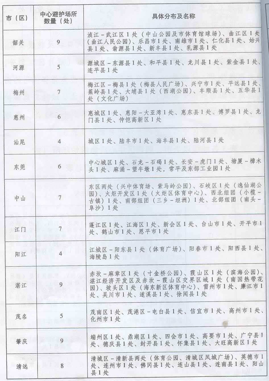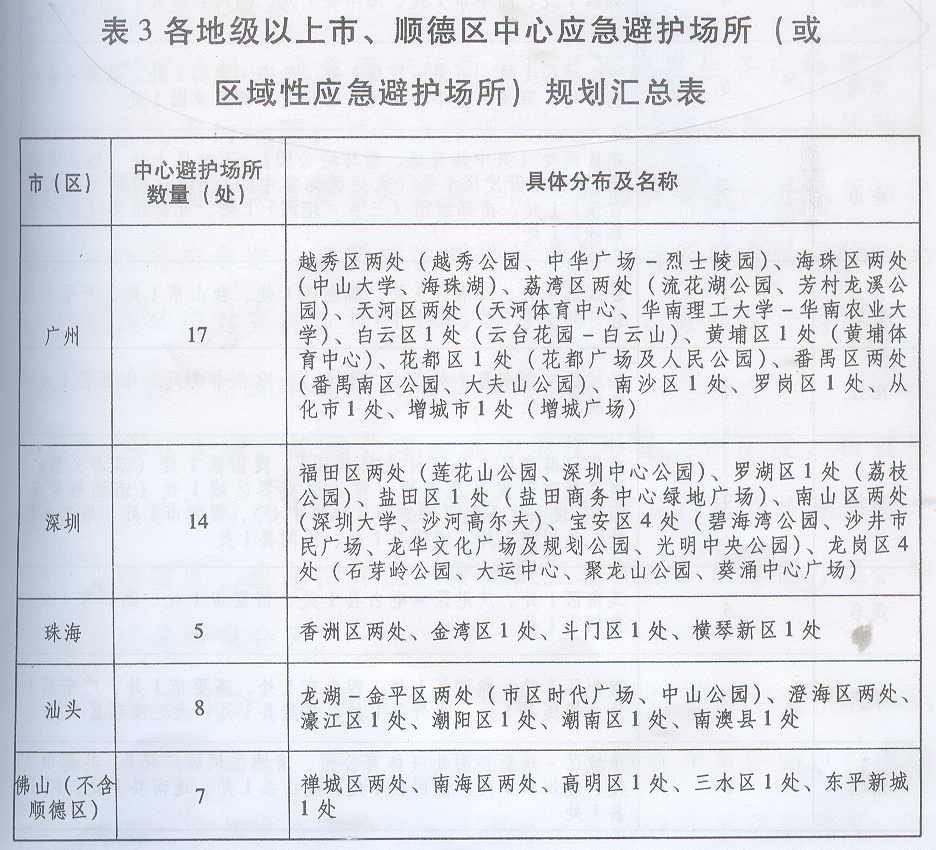 (2)各地級(jí)以上市要根據(jù)固定應(yīng)急避護(hù)場(chǎng)所規(guī)劃建設(shè)總體規(guī)模,結(jié)合當(dāng)?shù)鼐唧w的人口分布和場(chǎng)所服務(wù)半徑、選址布局原則、用地條件,以及現(xiàn)有和規(guī)劃的公園、體育場(chǎng)、廣場(chǎng)綠地、學(xué)校操場(chǎng)、綜合車場(chǎng)等室外場(chǎng)地,具體進(jìn)行固定應(yīng)急避護(hù)場(chǎng)所的空間布點(diǎn)和規(guī)模分配。 3.中心應(yīng)急避護(hù)場(chǎng)所規(guī)劃要求。 地級(jí)以上市按每50萬(wàn)人-150萬(wàn)人設(shè)置一處中心應(yīng)急避護(hù)場(chǎng)所(占地不小于10公頃),各縣(市、區(qū))原則上設(shè)置1處-2處中心應(yīng)急避護(hù)場(chǎng)所(每處占地不小于5公頃)。 綜合考慮地級(jí)以上市的行政區(qū)劃、服務(wù)人口以及救援要求,結(jié)合縣(市、區(qū))分布和城鎮(zhèn)內(nèi)部的功能組團(tuán)(或片區(qū))劃分,選取規(guī)模較大、功能較全、安全度較高,具有應(yīng)急指揮作用的固定應(yīng)急避護(hù)場(chǎng)所作為各城市中心應(yīng)急避護(hù)場(chǎng)所或區(qū)域性應(yīng)急避護(hù)場(chǎng)所。到2020年,全省中心應(yīng)急避護(hù)場(chǎng)所不少于153處,各地級(jí)以上市、順德區(qū)中心應(yīng)急避護(hù)場(chǎng)所數(shù)量詳見(jiàn)表3。 表3各地級(jí)以上市、順德區(qū)中心應(yīng)急避護(hù)場(chǎng)所(或 區(qū)域性應(yīng)急避護(hù)場(chǎng)所)規(guī)劃匯總表 ?
