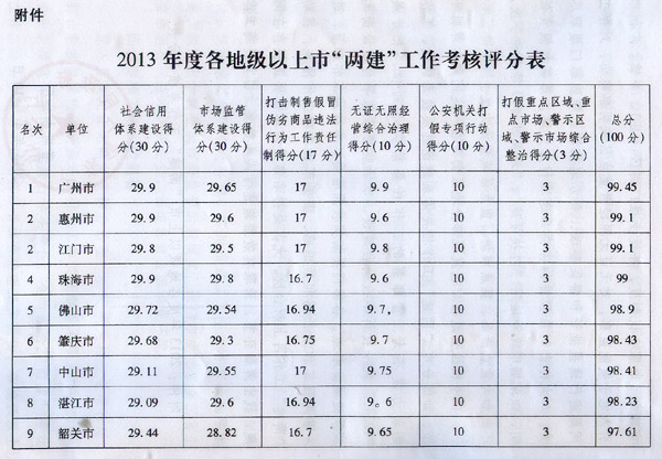 2013年以來,全省各地認(rèn)真貫徹落實(shí)省委、省政府關(guān)于社會(huì)信用體系建設(shè)和市場(chǎng)監(jiān)管體系建設(shè)(以下簡(jiǎn)稱“兩建”)工作的各項(xiàng)部署,加強(qiáng)組織領(lǐng)導(dǎo),明確分工責(zé)任,分解工作任務(wù),有計(jì)劃、有目標(biāo)、有步驟地組織開展“兩建”工作,為我省經(jīng)濟(jì)平穩(wěn)健康發(fā)展、社會(huì)和諧穩(wěn)定作出了積極貢獻(xiàn)。根據(jù)《中共廣東省委辦公廳廣東省人民政府辦公廳關(guān)于撤并和規(guī)范省級(jí)考核檢查評(píng)比表彰活動(dòng)的意見》(粵辦發(fā)〔2013〕11號(hào)),2014年1月,省“兩建”工作領(lǐng)導(dǎo)小組辦公室對(duì)各地級(jí)以上市“兩建”工作進(jìn)行了考核。經(jīng)綜合評(píng)定,21個(gè)地級(jí)以上市“兩建”工作考核全部合格,其中,廣州、惠州、江門、珠海市成績(jī)比較顯著。經(jīng)省人民政府同意,現(xiàn)將各地“兩建”工作情況通報(bào)如下: 一、精心部署落實(shí) 省“兩建”工作會(huì)議召開后,各地級(jí)以上市政府高度重視,及時(shí)召開相關(guān)工作會(huì)議,認(rèn)真貫徹落實(shí)省委、省政府關(guān)于“兩建”工作的政策部署,并以多種形式出臺(tái)有關(guān)文件,狠抓各項(xiàng)工作任務(wù)落實(shí)。在市場(chǎng)監(jiān)管體系建設(shè)方面,廣州、深圳等市結(jié)合實(shí)際制定了本市的市場(chǎng)監(jiān)管體系建設(shè)規(guī)劃,惠州、陽江等市制定了貫徹落實(shí)省市場(chǎng)監(jiān)管體系建設(shè)規(guī)劃的實(shí)施意見;在社會(huì)信用體系建設(shè)方面,廣州、珠海、中山等市制訂了《社會(huì)信用體系建設(shè)規(guī)劃(2013—2020年)》,廣州市還出臺(tái)了《廣州市信息共享管理規(guī)定》、《廣州市社會(huì)信用促進(jìn)條例》等多項(xiàng)規(guī)章制度。 一是市場(chǎng)準(zhǔn)入體系建設(shè)取得較大突破。率先在全國(guó)開展商事登記制度改革試點(diǎn),按照“寬進(jìn)嚴(yán)管”的原則,推進(jìn)工商登記制度改革,清理、壓減前置審批事項(xiàng),放寬登記準(zhǔn)入條件,實(shí)行先證后照,強(qiáng)化事中、事后監(jiān)管。2013年3月1日,深圳、珠海正式實(shí)施具有地方性法規(guī)效力的商事登記制度。據(jù)統(tǒng)計(jì),深圳、珠海、東莞、順德等商事登記制度改革試點(diǎn)地區(qū),新登記市場(chǎng)主體增幅分別達(dá)到96.3%、41.5%、17.0%和16.4%,同期非試點(diǎn)地區(qū)市場(chǎng)主體增幅僅為0.5%。二是行政執(zhí)法體系建設(shè)取得良好效果。進(jìn)一步深化行政審批制度改革,大力簡(jiǎn)政放權(quán),共調(diào)整市級(jí)行政審批事項(xiàng)6165項(xiàng)、縣級(jí)14934項(xiàng)。積極探索建立綜合行政執(zhí)法體制,推動(dòng)執(zhí)法重心下移。佛山市順德區(qū)按土地、醫(yī)藥、市場(chǎng)、城市管理四大領(lǐng)域,整合行政執(zhí)法職責(zé)和隊(duì)伍,規(guī)范行政執(zhí)法行為,規(guī)范行政處罰自由裁量權(quán);珠海市制定《珠海市行政機(jī)關(guān)執(zhí)法依據(jù)匯編》、《珠海市規(guī)范行政處罰自由裁量權(quán)工作方案》。三是消費(fèi)維權(quán)和社會(huì)監(jiān)督體系建設(shè)取得重大進(jìn)展。以“12345”熱線為載體整合各部門投訴舉報(bào)資源,建設(shè)便民、高效的消費(fèi)維權(quán)申訴、經(jīng)濟(jì)違法行為舉報(bào)和行政效能投訴平臺(tái),實(shí)現(xiàn)統(tǒng)一接聽、按責(zé)轉(zhuǎn)辦、限時(shí)辦結(jié)、統(tǒng)一督辦、統(tǒng)一考核。除東莞、揭陽市外,目前全省已有19個(gè)地級(jí)以上市實(shí)現(xiàn)“12345”統(tǒng)一投訴舉報(bào)平臺(tái)上線運(yùn)行。四是政務(wù)誠(chéng)信建設(shè)深入推進(jìn)。積極推進(jìn)招標(biāo)投標(biāo)和政府采購(gòu)領(lǐng)域政務(wù)誠(chéng)信建設(shè),全部實(shí)現(xiàn)各市縣網(wǎng)上辦事分廳與省網(wǎng)上辦事大廳對(duì)接,實(shí)現(xiàn)省、市、縣(區(qū))三級(jí)數(shù)據(jù)同步,進(jìn)一步提高行政審批效率。珠海市圍繞電子政務(wù)、科學(xué)民主決策等方面開展政務(wù)誠(chéng)信建設(shè),在網(wǎng)上辦事大廳珠海分廳增加公共資源網(wǎng)上交易、市民個(gè)人網(wǎng)頁等內(nèi)容。五是加快推進(jìn)質(zhì)量監(jiān)管體系建設(shè)。強(qiáng)化“不合格產(chǎn)品發(fā)現(xiàn)率”理念,著力完善產(chǎn)(商)品監(jiān)督抽查制度,大力實(shí)施標(biāo)準(zhǔn)化戰(zhàn)略,提升電子商務(wù)質(zhì)量,逐步建立現(xiàn)代質(zhì)量監(jiān)管體系。廣州、惠州等市大力完善公共與民生服務(wù)領(lǐng)域標(biāo)準(zhǔn)體系,深圳、佛山等市改革流通領(lǐng)域商品監(jiān)管方式,中山、茂名等市加強(qiáng)產(chǎn)品質(zhì)量監(jiān)督抽查,梅州、肇慶等市大力推動(dòng)旅游電子合同。六是進(jìn)一步理順食品安全監(jiān)管體制機(jī)制。以食品安全監(jiān)管體制改革為契機(jī),進(jìn)一步理順食品安全監(jiān)管職責(zé),出臺(tái)市縣兩級(jí)食品安全監(jiān)管體制改革文件,做好機(jī)構(gòu)編制、職能調(diào)整和人員劃分等工作。 一是信用激勵(lì)和懲戒機(jī)制建設(shè)取得明顯成效。惠州、珠海市分別出臺(tái)了《關(guān)于建立企業(yè)信用
