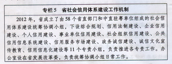 ? 第一節(jié) 加強組織領導 ? ——強化統(tǒng)籌協(xié)調(diào)。省社會信用體系建設統(tǒng)籌協(xié)調(diào)小組承擔規(guī)劃實施的協(xié)調(diào)指導工作,建立定期會商制度,研究解決社會信用體系建設中的重大問題;各專責小組及其成員單位根據(jù)規(guī)劃確定的建設任務,按照職責分工,制訂行動計劃,全力推進相關建設工作。各地社會信用體系建設統(tǒng)籌協(xié)調(diào)小組要切實加強對本地區(qū)社會信用體系建設的協(xié)調(diào)指導。?