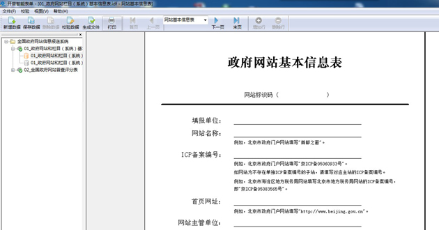 (二)填報政府網(wǎng)站和欄目(系統(tǒng))基本信息。 填報單位運行客戶端軟件,打開“政府網(wǎng)站和欄目(系統(tǒng))基本信息表”并新建數(shù)據(jù),填寫政府網(wǎng)站和欄目(系統(tǒng))基本信息并保存。表單所有信息項均為必填項,如確無內(nèi)容請?zhí)顚憽盁o”。 填寫完成并校驗無誤后,使用“生成文件”功能形成電子版文件,并將該電子版文件報送本級組織單位。