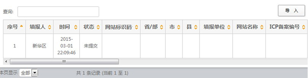 (三)逐級審核。 組織單位在收到上報文件后,使用賬號和密碼登錄報送系統(tǒng),在“政府網(wǎng)站和欄目(系統(tǒng))基本信息表”的數(shù)據(jù)管理頁面中,將上報文件導(dǎo)入系統(tǒng)。