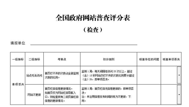| 一級指標(biāo) | 二級指標(biāo) | 考察點 | 扣分細則 | 存在的問題 | 扣分 | | 單項否決 | 站點無法訪問 | 首頁打不開的次數(shù)占全部監(jiān)測次數(shù)的比例。 | 監(jiān)測1周,每天間隔性訪問20次以上,超過(含)15秒網(wǎng)站仍打不開的次數(shù)比例累計超過(含)5%,即單項否決。 | | — | | 網(wǎng)站不更新 | 首頁欄目信息更新情況。