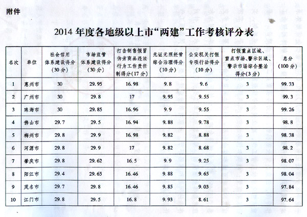 按照省委、省政府關(guān)于加強社會信用體系建設(shè)和市場監(jiān)管體系建設(shè)(以下簡稱“兩建”)工作部署和《2014年度廣東省社會信用體系建設(shè)和市場監(jiān)管體系建設(shè)工作考核方案》要求,省“兩建”工作領(lǐng)導(dǎo)小組辦公室牽頭組織省有關(guān)單位對各地級以上市政府“兩建”工作進(jìn)行了考核。經(jīng)綜合評定,21個地級以上市考核全部合格,其中,惠州、廣州、珠海市成績顯著。經(jīng)省人民政府同意,現(xiàn)將全省“兩建”工作情況通報如下: