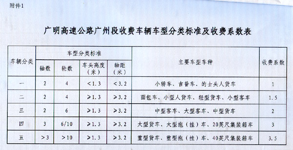粵交費〔2015〕414號請示收悉。同意廣明高速公路廣州段建成通車和收費站收費設施經驗收符合省聯(lián)網收費技術要求后開始收費,收費車型按全省高速公路統(tǒng)一標準,即按車輛軸(輪)數(shù)及車頭高度等物理參數(shù)進行分類,一至五類車的收費系數(shù)分別為1、1.5、2、3、3.5;收費標準為0.6元/標準車公里。