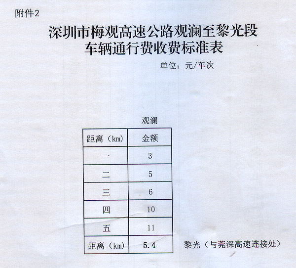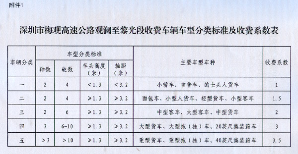 ? 廣東省人民政府關于深圳市梅觀高速公路觀瀾 至黎光段等路段車輛通行費問題的批復 ? 粵交費〔2015〕350號請示收悉,現(xiàn)就有關事項批復如下: 一、同意深圳市梅觀高速公路觀瀾主線收費站建成后納入全省高速公路聯(lián)網(wǎng)收費系統(tǒng),對過往車輛實行封閉式收費。觀瀾至黎光段收費車型按全省高速公路統(tǒng)一標準,即按車輛軸(輪)數(shù)及車頭高度等物理參數(shù)進行分類,一至五類車的收費系數(shù)分別為1、1.5、2、3、3.5;收費標準為0.6元/標準車公里。
