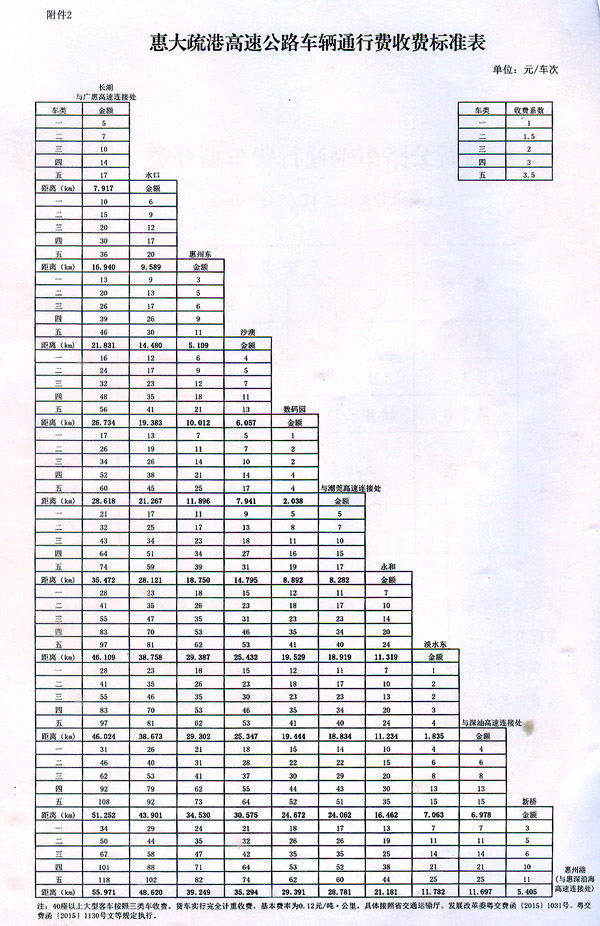 粵交費〔2015〕1101號請示收悉。同意惠大疏港高速公路建成通車和收費站收費設施經(jīng)驗收符合省聯(lián)網(wǎng)收費技術要求后開始收費,收費車型按國家統(tǒng)一標準進行分類,一至五類車的收費系數(shù)分別為1、1.5、2、3、3.5,收費標準為0.6元/標準車公里;貨車實行完全計重收費,基本費率為0.12元/噸·公里。