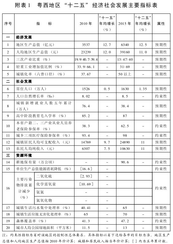 附表1:粵西地區(qū)“十二五”經(jīng)濟(jì)社會發(fā)展主要指標(biāo)表