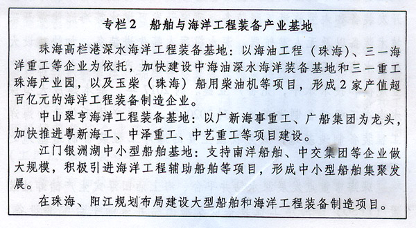 珠海市重點(diǎn)發(fā)展深水鉆井平臺(tái)、海上油田浮式生產(chǎn)儲(chǔ)卸油裝置(FPSO)等海洋工程裝備以及海上鉆井采油平臺(tái)配套設(shè)備,加快發(fā)展正面吊、起重機(jī)械等臨港工程機(jī)械和船用高中低速柴油機(jī),積極推進(jìn)游艇產(chǎn)業(yè)發(fā)展,形成產(chǎn)業(yè)集聚。