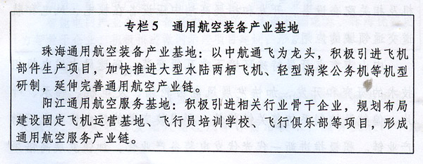 以珠海市為主,以低空領(lǐng)域開放為契機(jī),重點(diǎn)發(fā)展航空關(guān)鍵技術(shù)研發(fā),以及通用飛機(jī)、水上飛機(jī)、無人機(jī)、特種飛行器和輕型直升機(jī)等,積極發(fā)展機(jī)場(chǎng)空管導(dǎo)航監(jiān)視裝備和牽引車、氣源車、電源車和空調(diào)車等機(jī)場(chǎng)地勤設(shè)備。研究開發(fā)地效飛行器、通用航空發(fā)動(dòng)機(jī)等高端航空裝備。到2017年,培育壯大1家通航裝備制造企業(yè)。到2020年,成為國內(nèi)主要通用航空產(chǎn)業(yè)基地之一。
