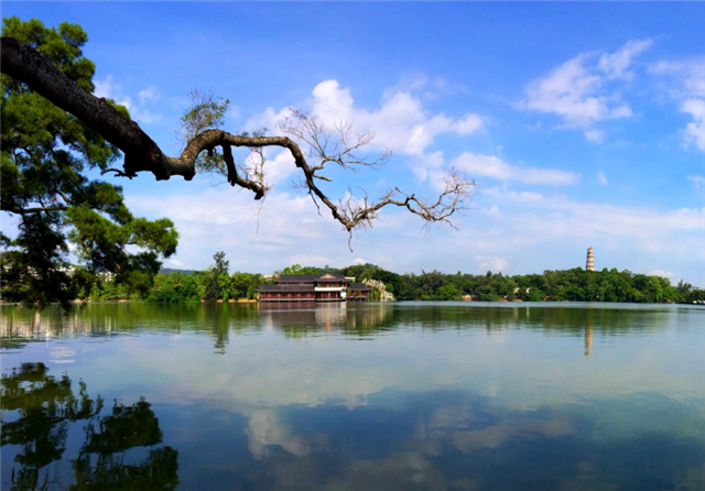 “鐵鏈鎖孤舟,浮鵝水上游,任憑風浪起,此地永無憂!”一首膾炙人口代代相傳的民謠,唱出了“半城山色半城湖”的秀美與奇特、嫵媚與風情!城在湖中,湖在山中,不出城郭可獲山水之怡;推窗見水,開門看綠,身居鬧市亦有林泉之趣。