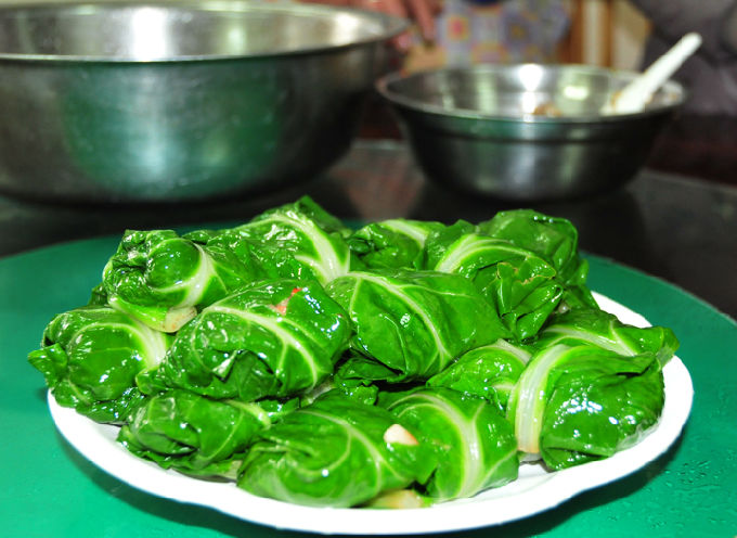 莙荙包的餡料有多種,包括臘肉、香菇、紅蘿卜、白蘿卜、香芋、冬筍等,全部切丁后加入蝦米,餡料就備好了。再在鍋中置油燒熱,放入紅蔥頭末小火炒出香味,加入餡料和調(diào)味料拌炒均勻,煮熟盛起,便成為餡菜。然后將洗凈的莙荙葉放進(jìn)盛著熱水的盆里,拿去制作莙荙包。包好后,放入鍋里文火燜煮七、八分鐘后即可食用。