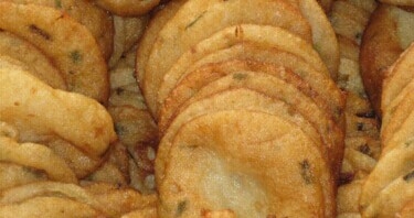 油罩糍起名是由于其制作方法,用一個(gè)叫油罩的工具,盛上米漿再放入油鍋里煎出來(lái)的,故得油罩糍。