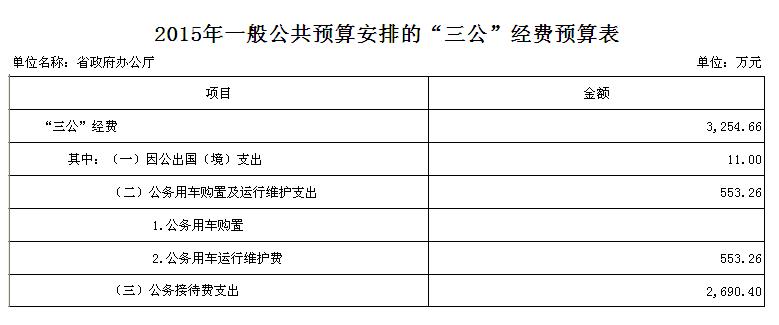 2015年一般公共預(yù)算安排的“三公”經(jīng)費(fèi)預(yù)算數(shù)為3,254.66萬(wàn)元,其中:因公出國(guó)(境)支出預(yù)算11.00萬(wàn)元;公務(wù)用車(chē)購(gòu)置及運(yùn)行維護(hù)支出預(yù)算553.26萬(wàn)元(本年度此項(xiàng)支出預(yù)算全部為公務(wù)用車(chē)運(yùn)行維護(hù)費(fèi));公務(wù)接待費(fèi)支出預(yù)算2,690.40萬(wàn)元。