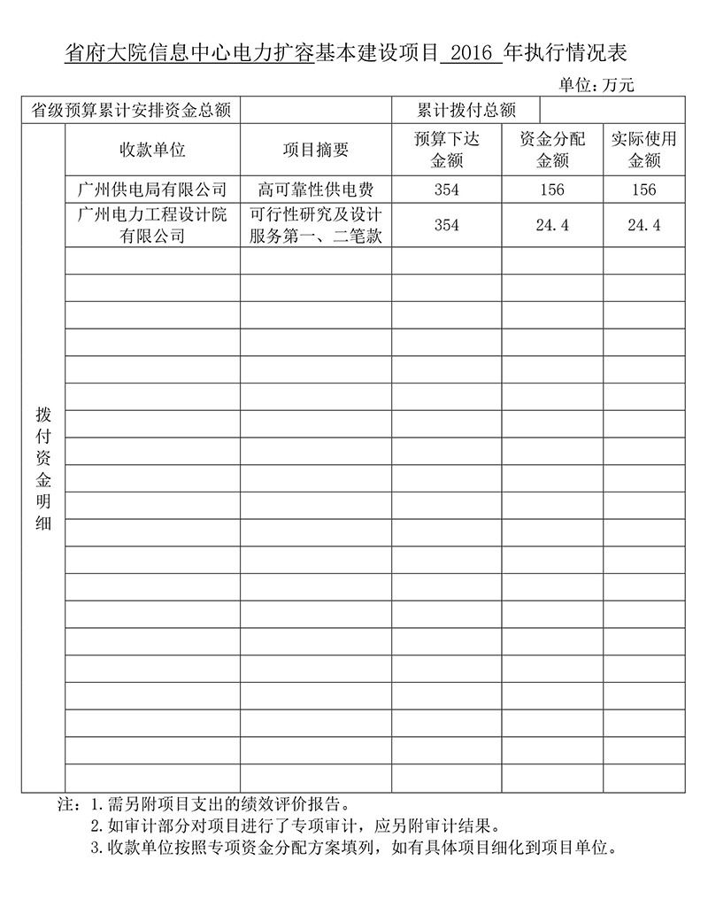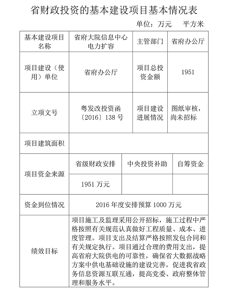省府大院信息中心電力擴(kuò)容項(xiàng)目由我廳于2015年1月向省發(fā)展改革委申請(qǐng)立項(xiàng)(粵辦函〔2015〕1號(hào)),今年1月省發(fā)展改革委粵發(fā)改投資函〔2016〕138號(hào)文批復(fù)我廳同意項(xiàng)目立項(xiàng),今年3月你廳粵財(cái)建〔2016〕27號(hào)文批復(fù)該項(xiàng)目2016年度預(yù)算資金1000萬(wàn)元。